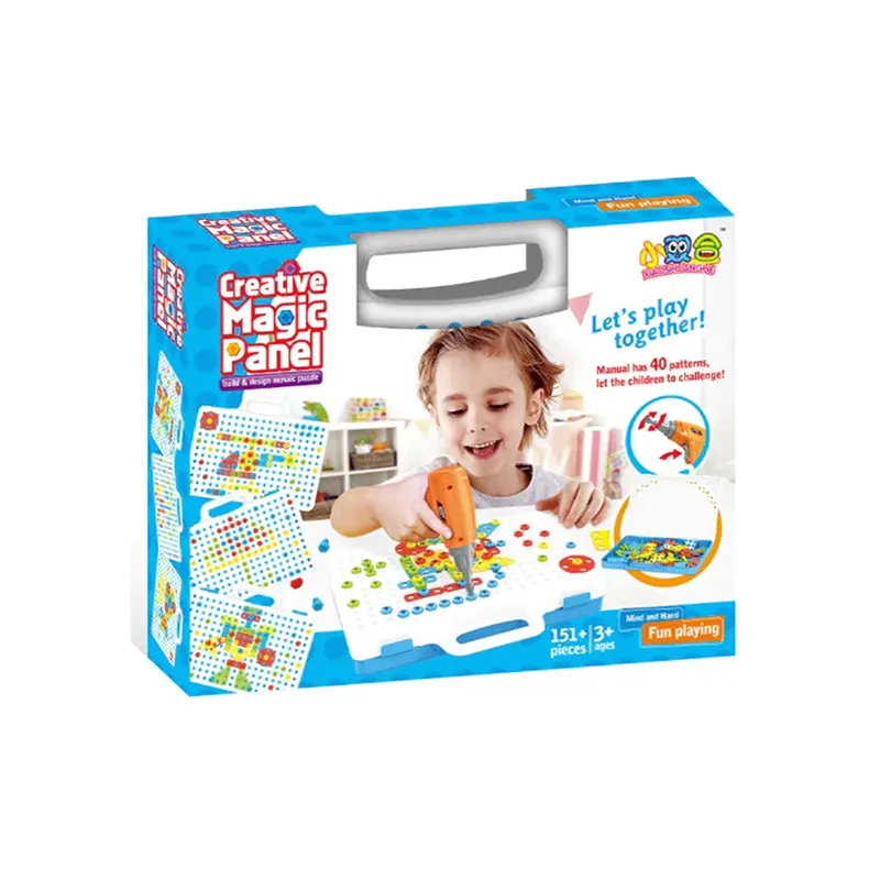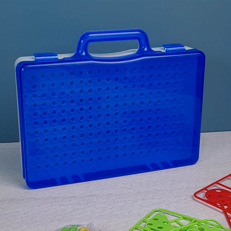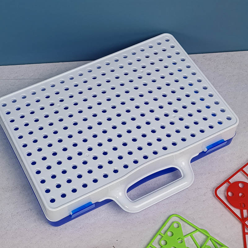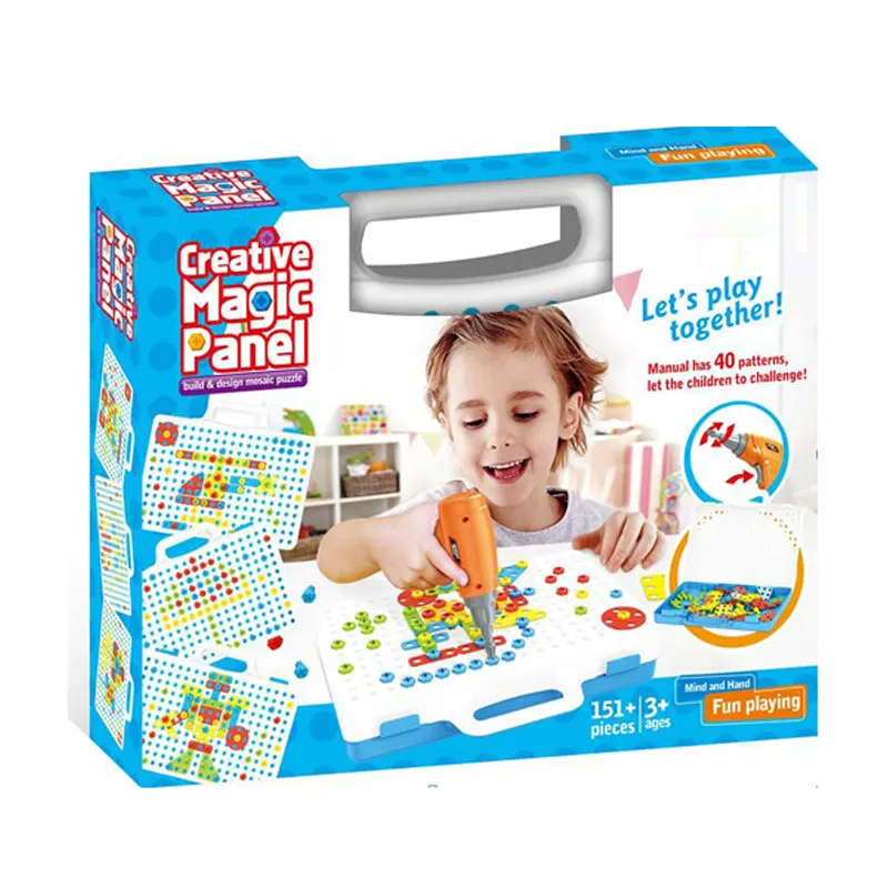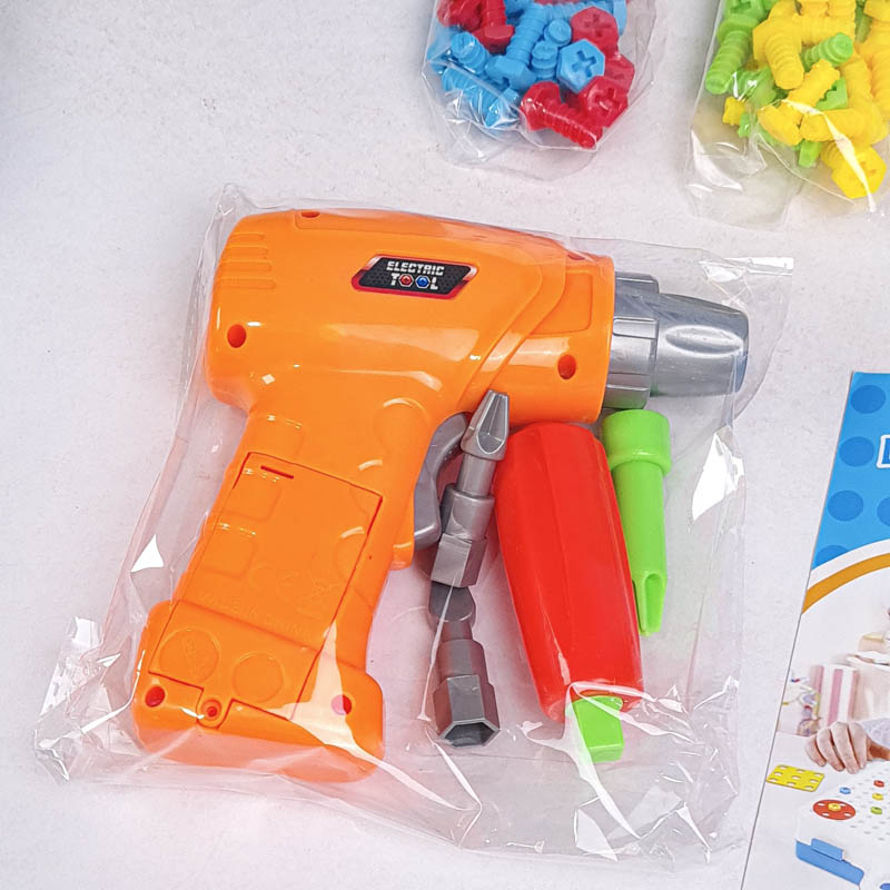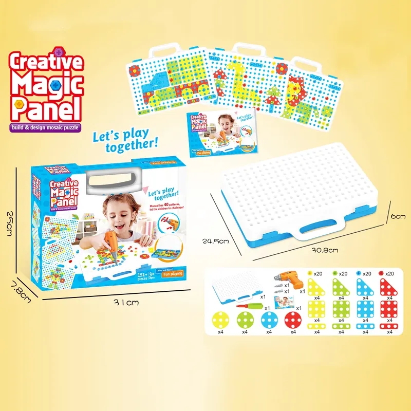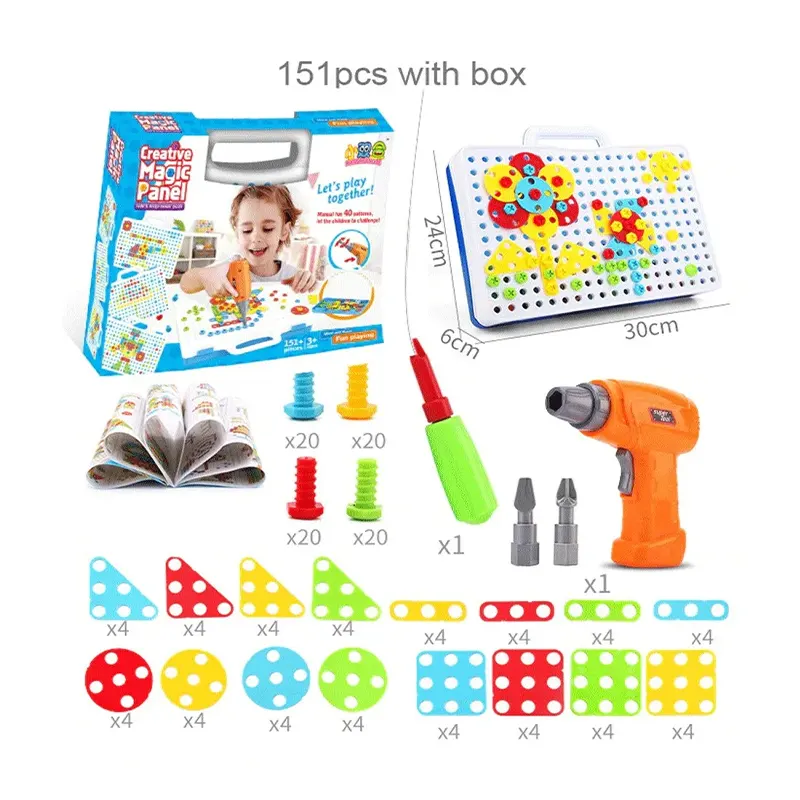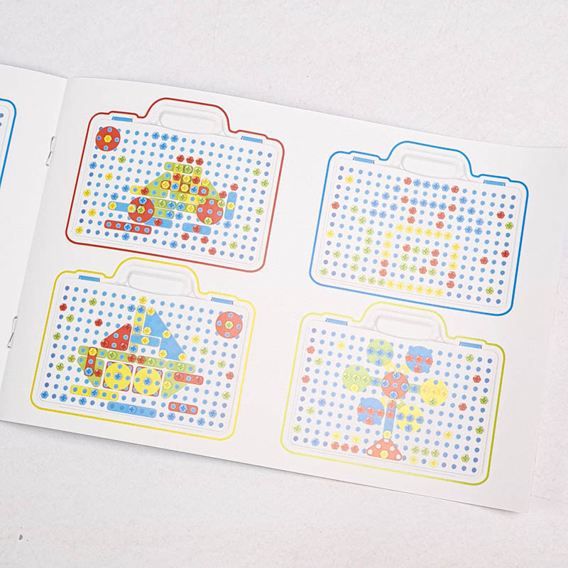 | اقلام همراه | 80 عدد پیچ رنگی، 16 عدد پترن مثلث، 16 عدد پترن مربع، 16 عدد پترن مستطیل، 16 عدد پترن دایره، دریل، پیچ گوشتی، دفترچه راهنما، صفحه بازی |