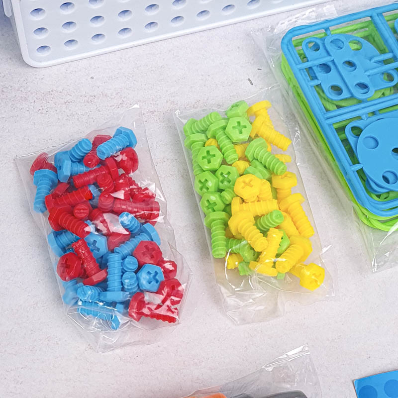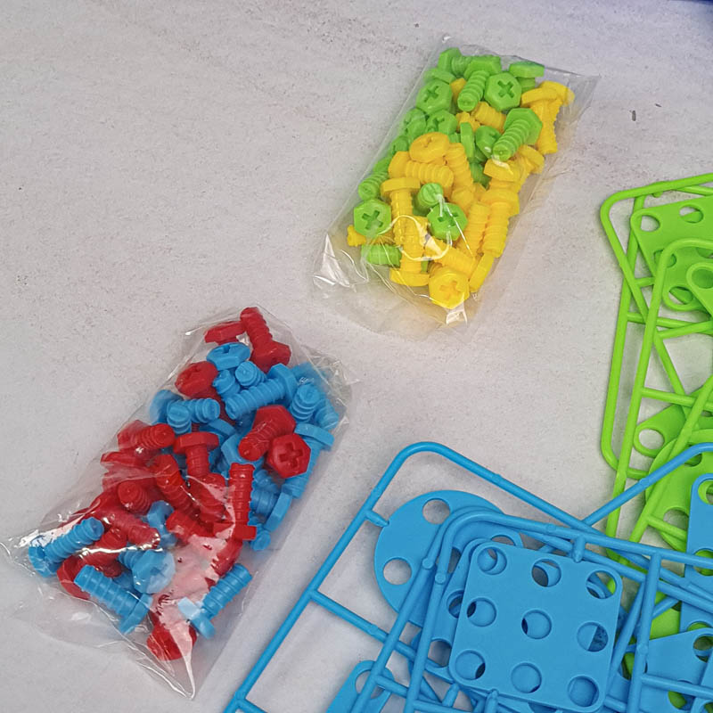 - دارای 80 عدد پیچ رنگی، 16 عدد پترن مثلث، 16 عدد پترن مربع، 16 عدد پترن مستطیل، 16 عدد پترن دایره، دریل، پیچ گوشتی، دفترچه راهنما، صفحه بازی
