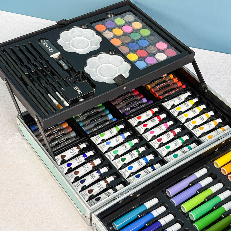 ست نقاشی 143 تکه شامل: 33 ماژیک، 24 مدادشمعی، 24 رنگ آبرنگ، 28 رنگ مداد رنگی، 24 رنگ گواش، 4 عدد قلم مو، 2 عدد مداد، مداد تراش، 2 عدد پاک کن و 2 پالت برای استفاده و ترکیب رنگ ها می باشد