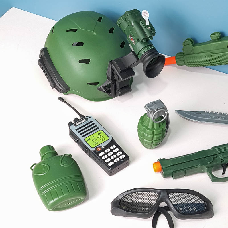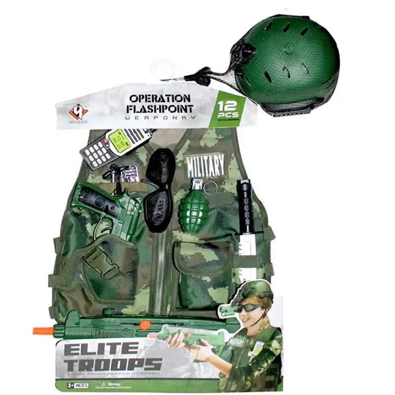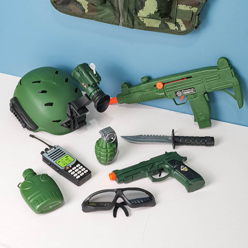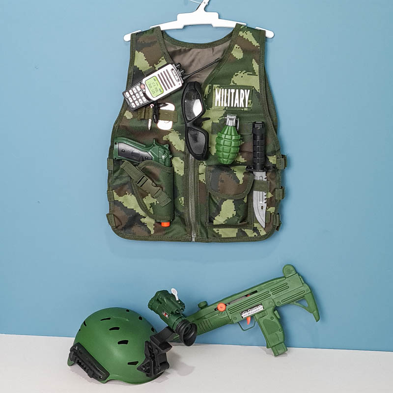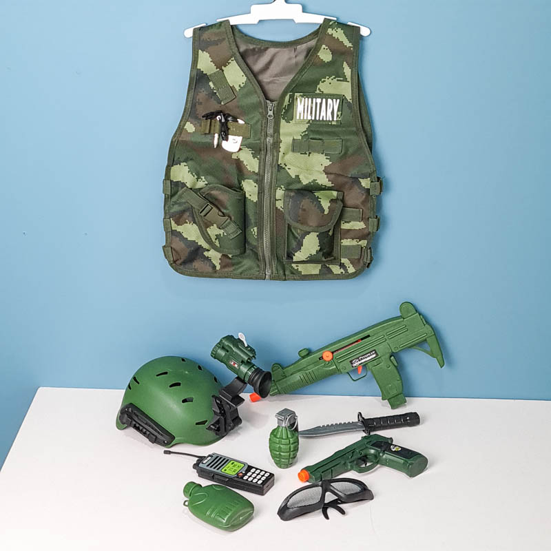 - لباس مشاغل کودک پلیس ارتش با لوازم شامل جلیقه، کلاه، تفنگ، عینک، چاقو، قمقمه، بی سیم و... می باشد