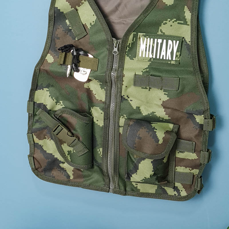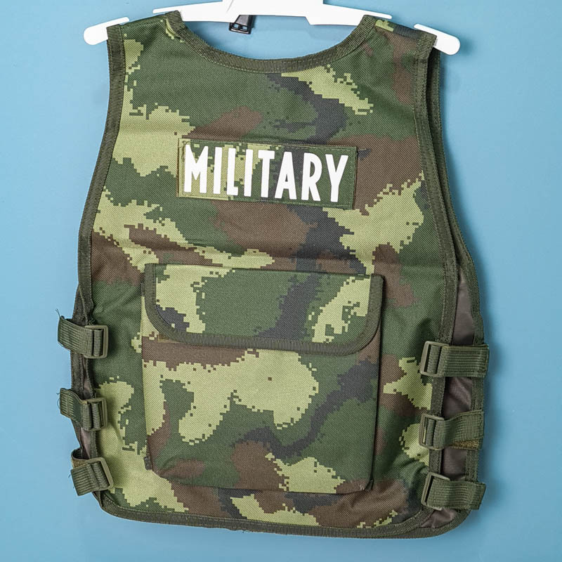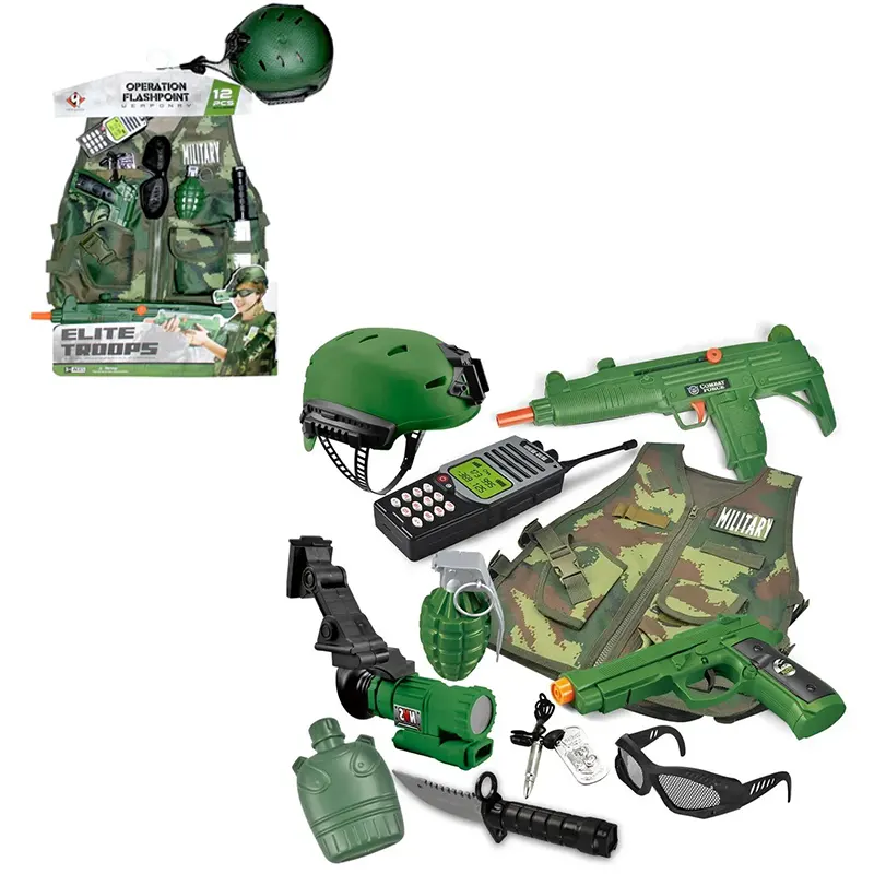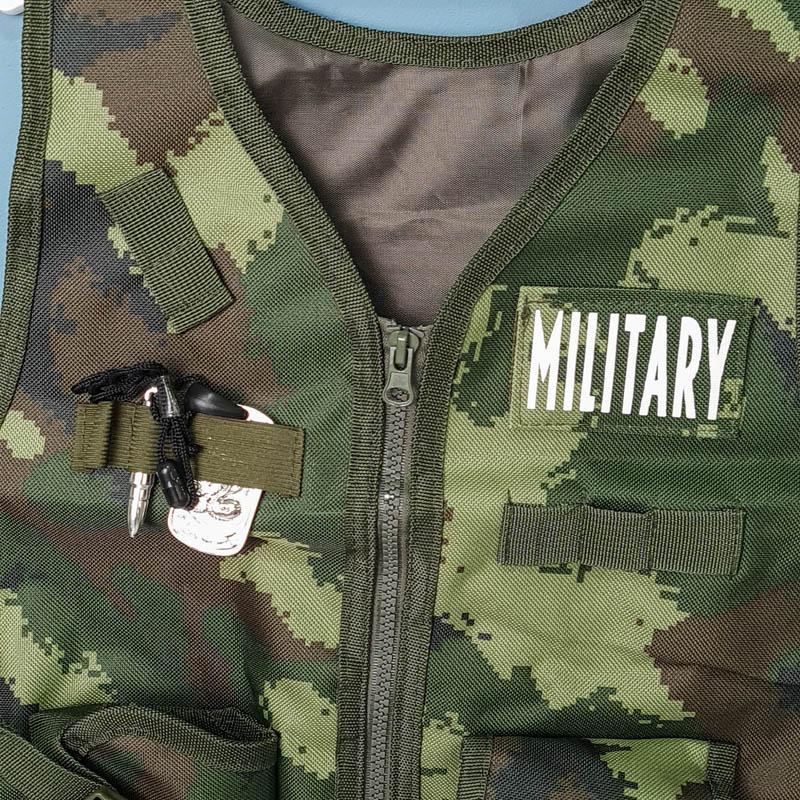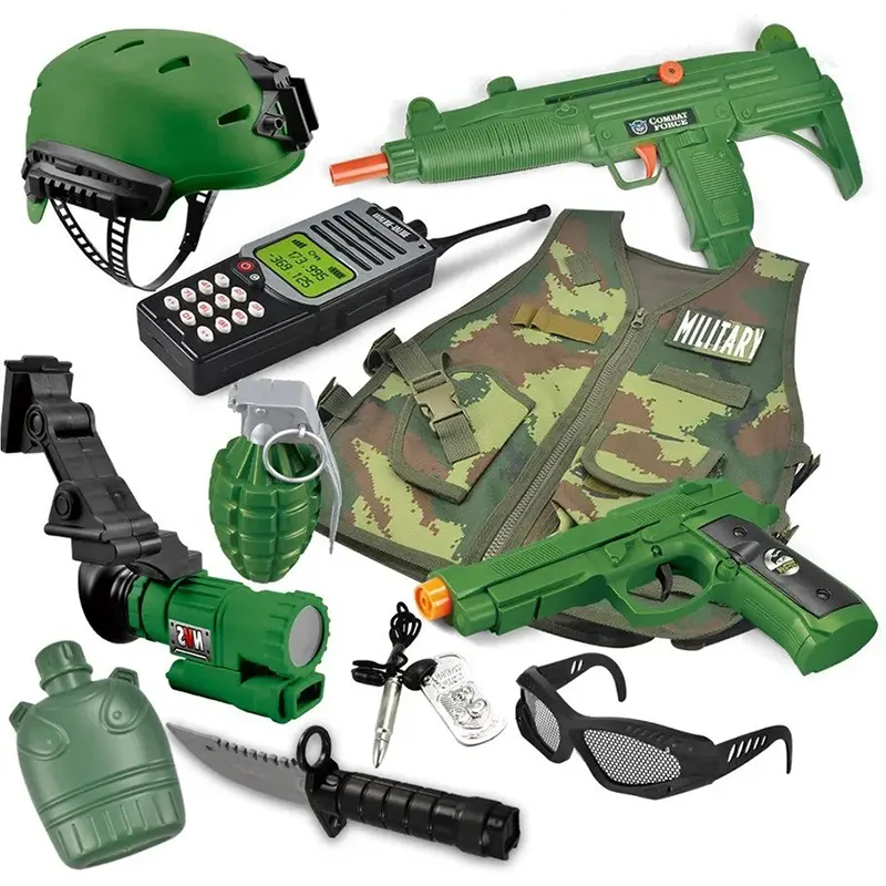 - لباس مشاغل کودک پلیس ارتش با لوازم شامل جلیقه، کلاه، تفنگ، عینک، چاقو، قمقمه، بی سیم و... می باشد