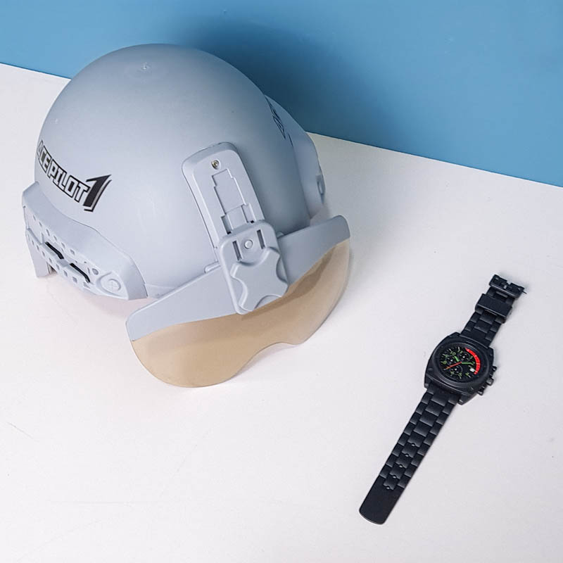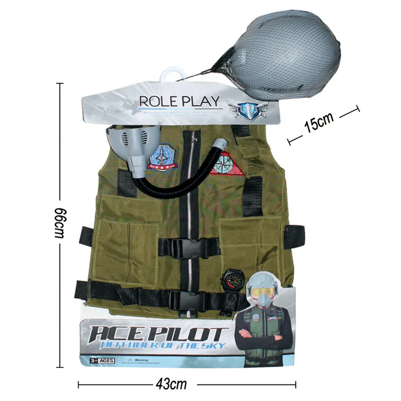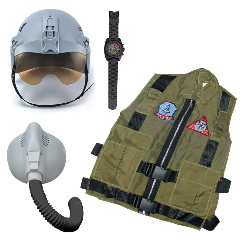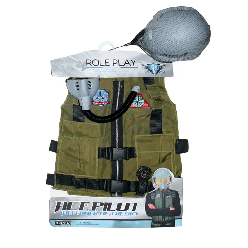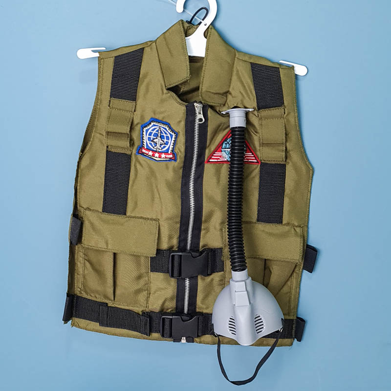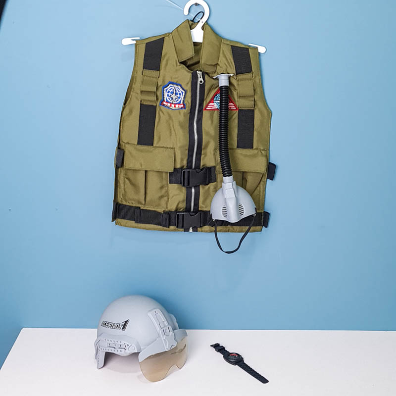 - لباس مشاغل کودک خلبان با لوازم شامل جلیقه، کلاه، ساعت، ماسک اکسیژن می باشد
