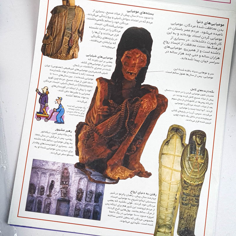 توتان خامن افسانه ای را که طول 1.5 متر است ببینید. لبه های آن را برگردانید تا این گنجینه پنهان آشکار شود. نقاب مرگ را از روی صورتش پس بزنید تا جمجمه مومیایی شده اش را ببینید. با خواندن این کتاب به حقایق شگفت انگیزی درباره مومیایی های سراسر دنیا پی میبرید و از اسرار تکان دهنده مومیایی ها آگاه میشوید.