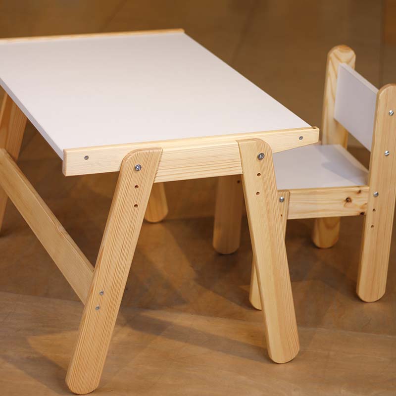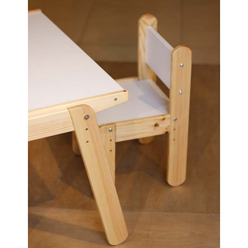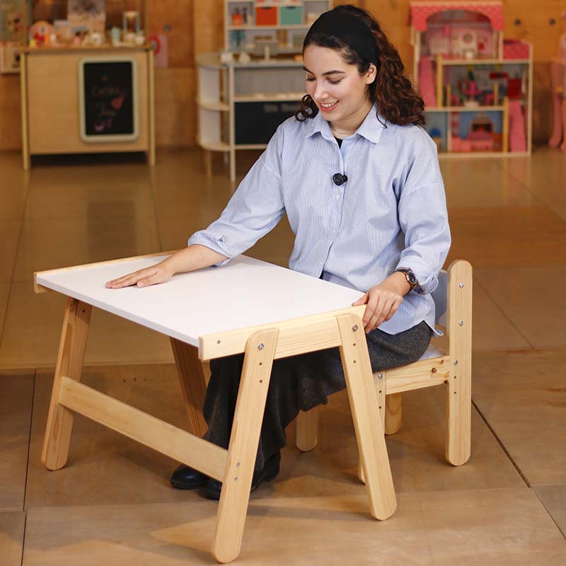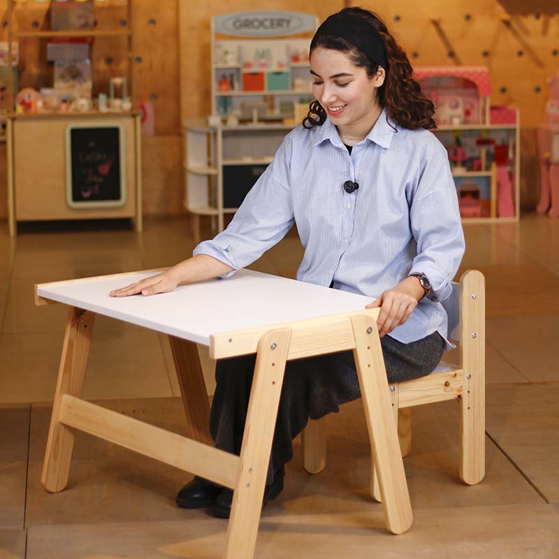 با استفاده از میز تحریر، کودک میتواند به صورت صحیح و درست بنشیند و تکالیف یا نقاشی هایش را بکشد این میز و صندلی کودک قابلیت تنظیم ارتفاع دارد بنابراین با رشد کودک شما این میز تحریر هم رشد خواهد کرد. سطح رویه میز از MDF سفید میباشد و پایه ها از چوب کاج و با کیفیت ساخته میشود. لازم به ذکر است تمامی لبه های میز کروی و بدون تیزی است تا از آسیب دیدگی و خش دار شدن لبهها جلوگیری شود و زیبایی میز حفظ گردد. این محصول دارای صفحهی ضدخش و ضد آب میباشد.