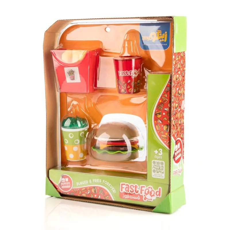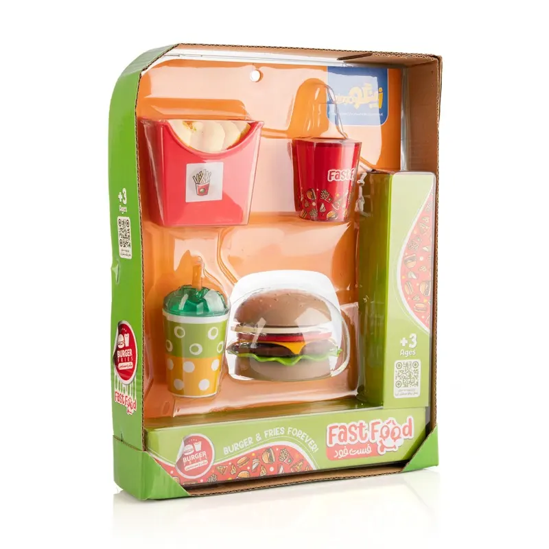 ست اسباب بازی همبرگر و سیب زمینی شامل سیب زمینی سرخ شده، نوشابه، لیوان، همبرگر میباشد. رنگ های شاد، اسباب بازی خوراکی های خوشمزه و بسته بندی جذاب این اسباب بازی کودک آن را به یک هدیه ایده آل تبدیل میکند و اشتیاق و اشتهای کودک را برای خوردن غذای واقعی بیشتر میکند. ست اسباب بازی فست فود حس تخیل، خلاقیت و داستان سرایی کودک را تقویت میکند و اشتهای کوچولوها رو به غذا بیشتر میکنه.