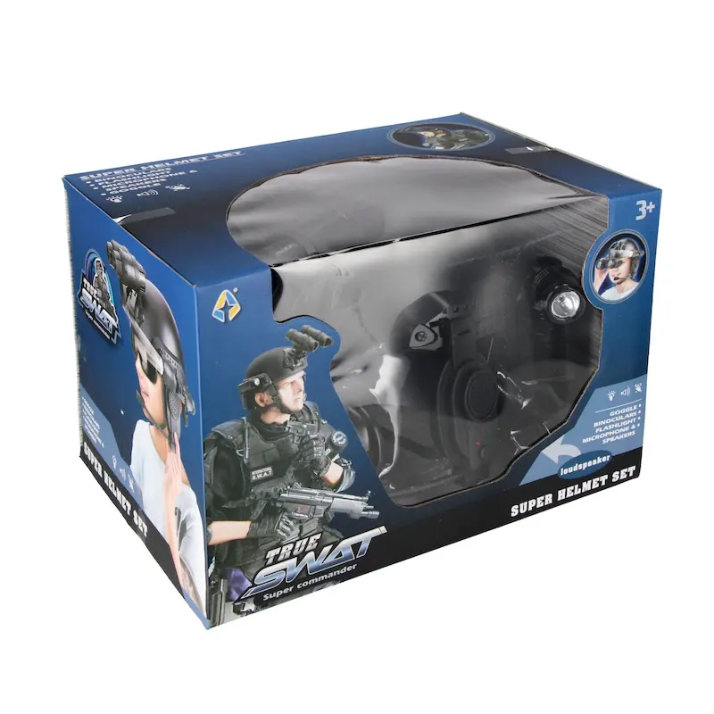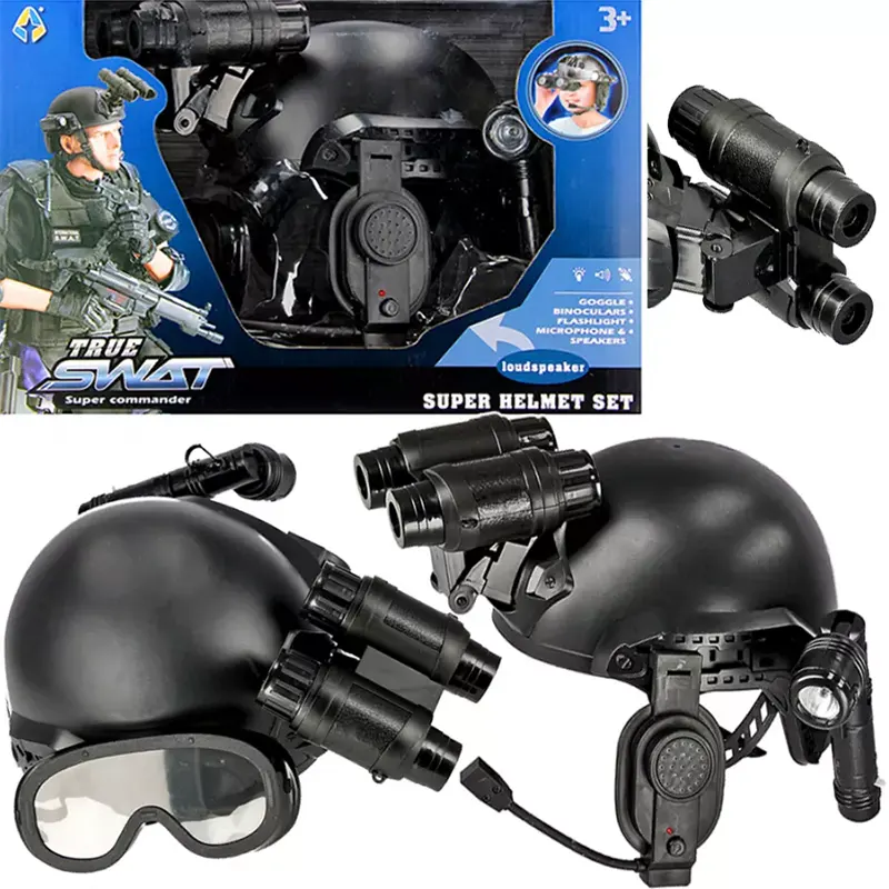اسباب بازی کلاه و دوربین پلیس یگان ویژه رنگ مشکی یک اسباب بازی با تجهیزات جنگی برای بازی و سرگرمی کودکان 3 سال به بالا است این کلاه پلیس دارای دوربین، میکروفون، دوربین شکاری است و دارای جلوه های نوری و صوتی زیباست.