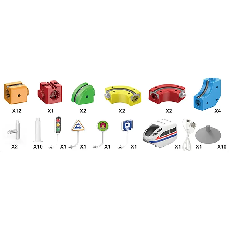- اقلام همراه: 23 بلوک ساختنی ریل، 10 مکنده، کابل شارژ USB، قطار، 4 علائم، 12 بسط