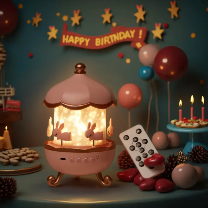 - ظاهر زیبا: طرح رنگی صورتی و طلایی زیبا با طراحی گنبدی تزئینی و چهرههای جذاب خرگوش که به آرامی میچرخند