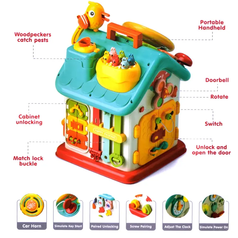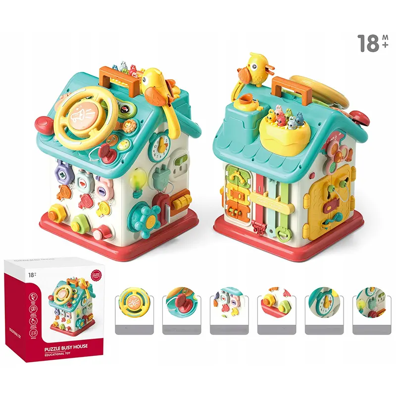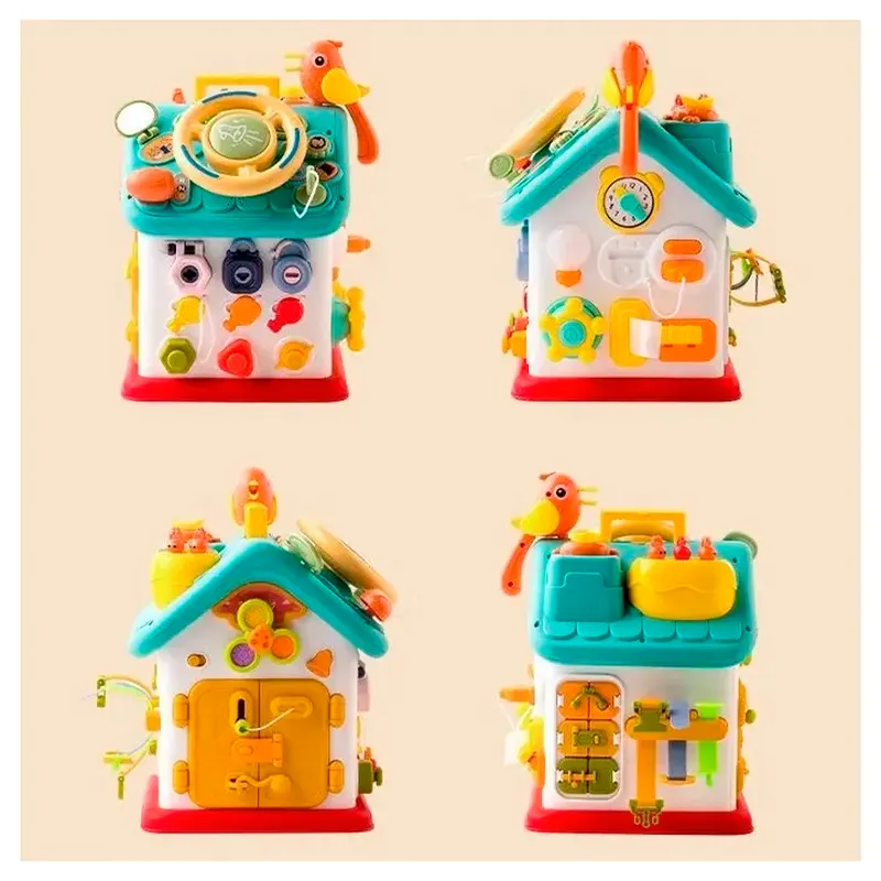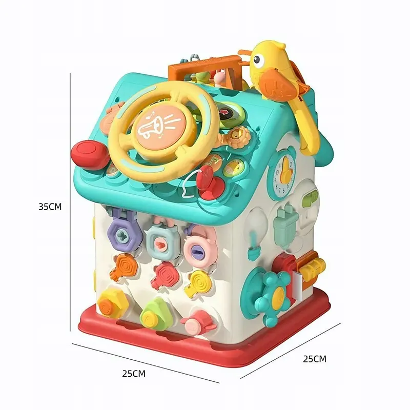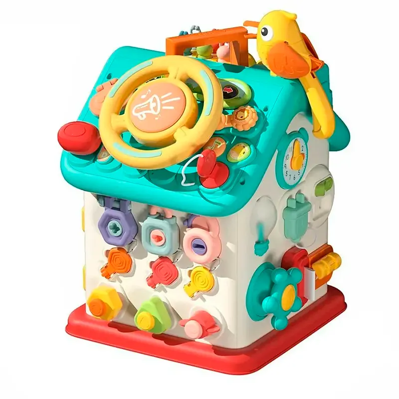اسباب بازی مکعب هوش به سرعت توجه بچه ها را به خود جلب می کند و در طول زمان بازی، سرگرمی بیشتری را برای آنها به ارمغان می آورد. هر سمت از این خانه حتی سقف هایش دارای بازی هایی هست که موجب تقویت هوش، مهارت های ذهنی و فیزیکی بچه ها میشه. بازی هایی مثل چرخاندن فرمان تعاملی، فشردن کلیدهای رنگی، باز و بسته کردن چفت، قفل و کلید، چرخش چرخدندهها، تکان دادن اسپینرهای دستی، تنظیم ساعت عقربهای، باز کردن درهای کوچک و کشوییها، قرار دادن اشکال پازلی جایگذاری (shape sorter) و... این اسباب بازی رو به یکی از جذاب ترین سرگرمی های بچه ها تبدیل کرده. مکعب هوش کودک یک اسباب بازی با چند بازی است تا کودک شما بتواند آموزش بیشتری ببیند. مکعب هوش چند منظوره به نوزادان و کودکان نوپا این امکان را می دهد که برای مدت طولانی با خود مشغول بازی شوند. همچنین این مکعب هوش با سطوح صاف، طراحی لبههای گرد و مقاومت در برابر ضربه قوی است و ساخته شده از پلاستیک ABS با کیفیت بالا و مواد سازگار با محیط زیست میباشد که غیر سمی، بدون BPA، بدون بو است.