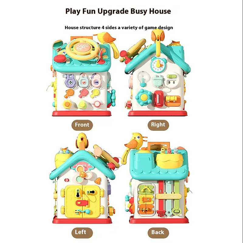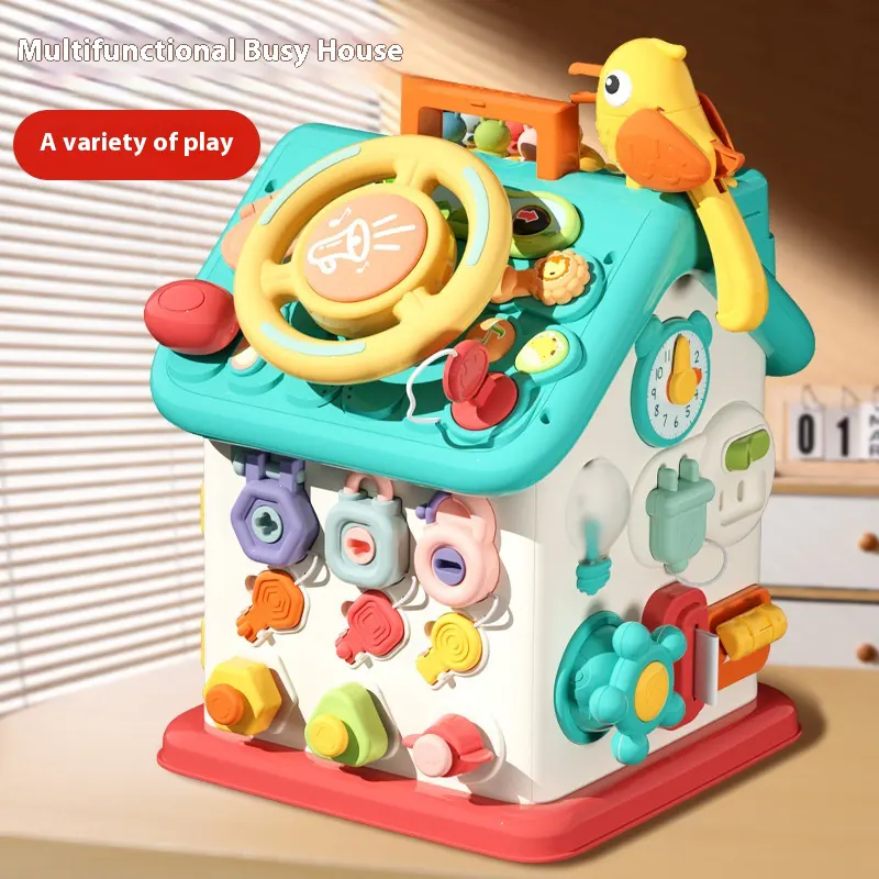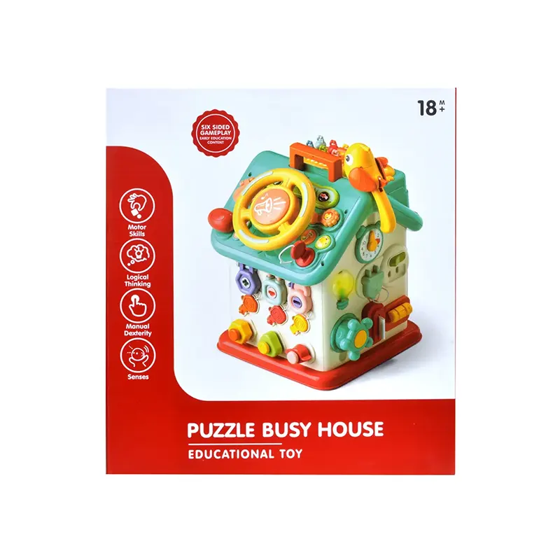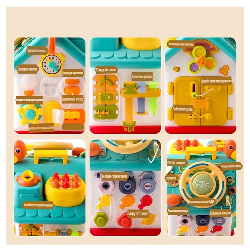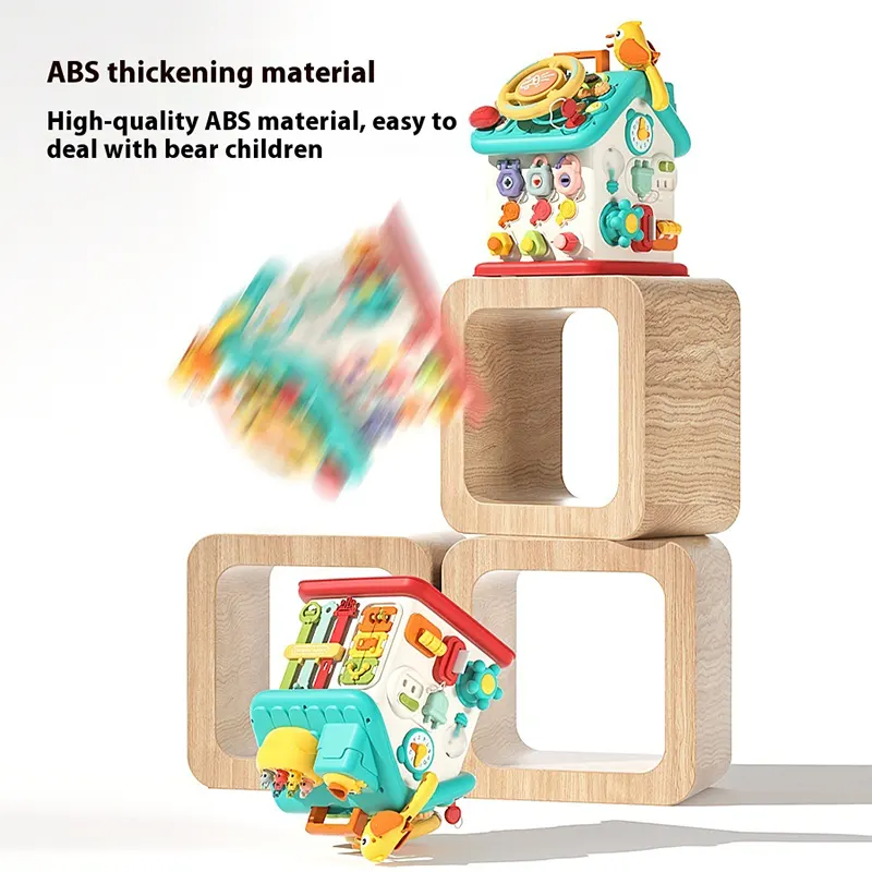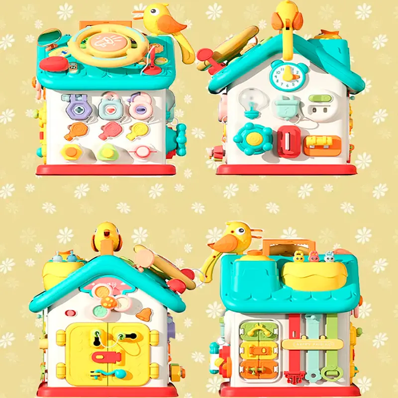 اسباب بازی مکعب هوش به سرعت توجه بچه ها را به خود جلب می کند و در طول زمان بازی، سرگرمی بیشتری را برای آنها به ارمغان می آورد. هر سمت از این خانه حتی سقف هایش دارای بازی هایی هست که موجب تقویت هوش، مهارت های ذهنی و فیزیکی بچه ها میشه. بازی هایی مثل چرخاندن فرمان تعاملی، فشردن کلیدهای رنگی، باز و بسته کردن چفت، قفل و کلید، چرخش چرخدندهها، تکان دادن اسپینرهای دستی، تنظیم ساعت عقربهای، باز کردن درهای کوچک و کشوییها، قرار دادن اشکال پازلی جایگذاری (shape sorter) و... این اسباب بازی رو به یکی از جذاب ترین سرگرمی های بچه ها تبدیل کرده. مکعب هوش کودک یک اسباب بازی با چند بازی است تا کودک شما بتواند آموزش بیشتری ببیند. مکعب هوش چند منظوره به نوزادان و کودکان نوپا این امکان را می دهد که برای مدت طولانی با خود مشغول بازی شوند. همچنین این مکعب هوش با سطوح صاف، طراحی لبههای گرد و مقاومت در برابر ضربه قوی است و ساخته شده از پلاستیک ABS با کیفیت بالا و مواد سازگار با محیط زیست میباشد که غیر سمی، بدون BPA، بدون بو است.