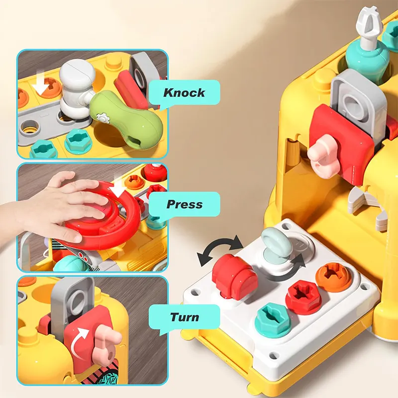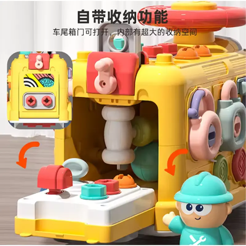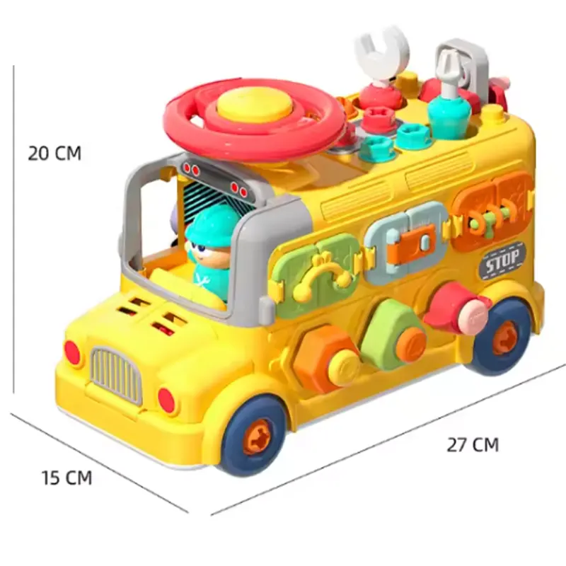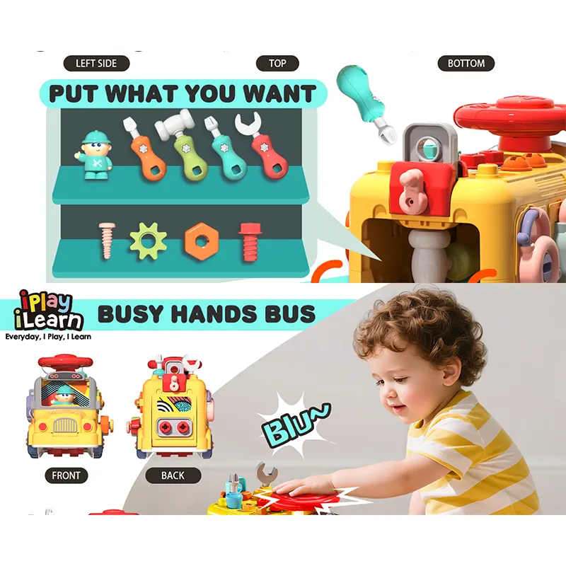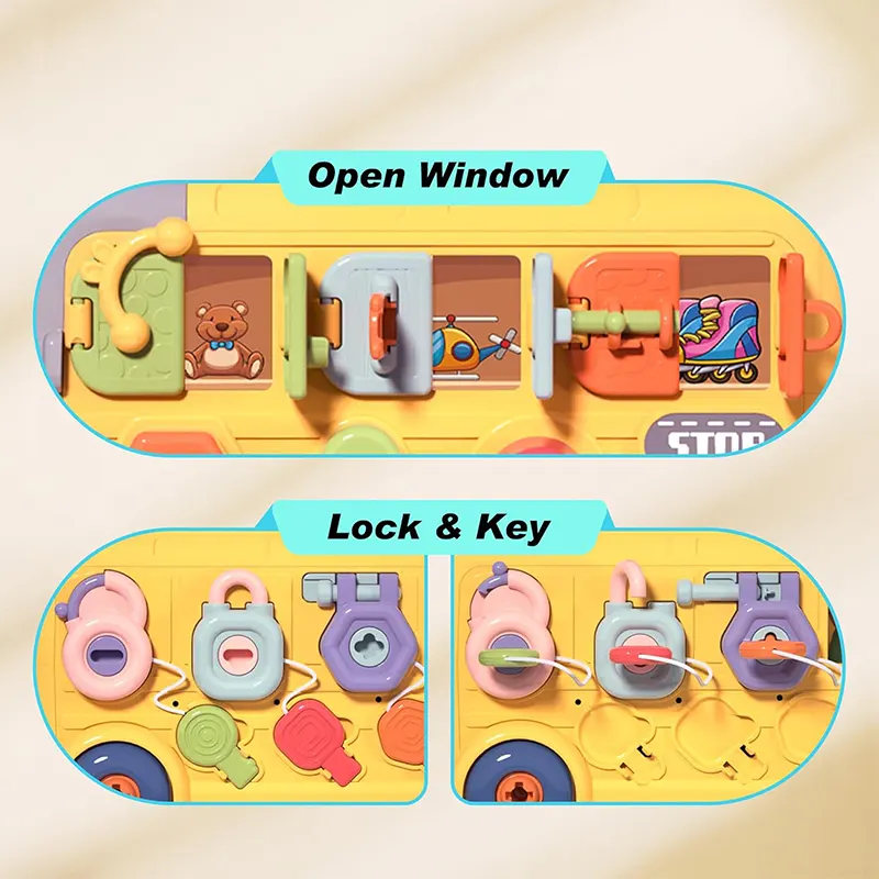 با هر وجه، سرگرمی بیپایانی را تجربه کنید! اسباب بازی مونته سوری سنسوری برد و بیزی کار مدل ماشین ابزار چند کاره یک اتوبوس زرد و بامزه است که هر قسمت آن یک سورپرایز و بازی برای بچه های بالای 3 سال دارد. از پیچ و مهره، قفل و کلید گرفته تا بازی چکش و ضربه، باز کردن در، چرخ دنده، فرمان و... است. بچهها هر طرف این اتوبوس را که بچرخانند، چالشهای جدیدی را کشف میکنند که سطح تعامل را بالا نگه میدارد و حوصلهشان را سر نمیبرد. این اتوبوس میتونه ساعت ها بچه ها رو سرگرم بازی کنن. بازی با این اسباب بازی باعث تقویت هوش کودک میشه همچنین باعث تقویت مهارت های حرکتی، شنوایی، بینایی و یادگیری در بچه ها میشود. این اسباب بازی فاقد مواد سمی و لبه های تیز است و برای بچه های بالای 3 سال میتواند یک کادو تولد عالی و هیجان انگیز باشه. بچرخانید، جور کنید و قدرت حل مسئله را تقویت کنید! چرخدندههای رنگارنگ درهم قفل میشوند، علت و معلول را آموزش میدهند. 6 چالش باز کردن قفل مختلف را حل کنید تا تفکر منطقی و آگاهی فضایی را از طریق بازی لمسی تقویت کنید. از طریق بازی، ذهن و عضلات را پرورش دهید! سنسوری برد و بیزی کار مدل ماشین ابزار حرکات دست را آموزش میدهد (پیچاندن، چفت کردن، چکش زدن و غیره) در حین ساختن پایههای STEM (علوم، فناوری، مهندسی و ریاضی) را تقویت میکند. از بازی ساده با ابزار گرفته تا مونتاژ پیچیده. دو بخش اصلی باز کردن قفل، شش حالت مختلف باز کردن قفل. هر طرف این اتوبوس دارای فعالیتهای آموزشی مختلف است.