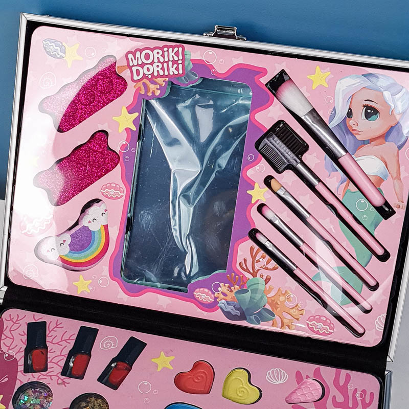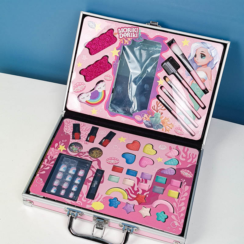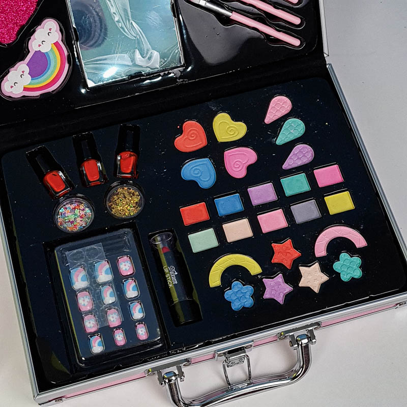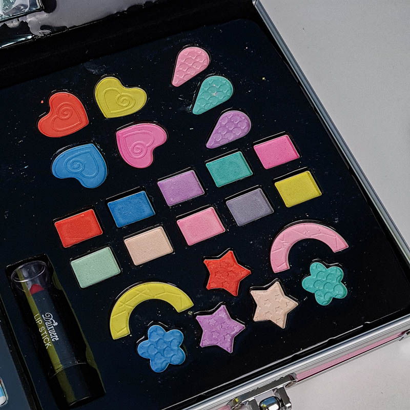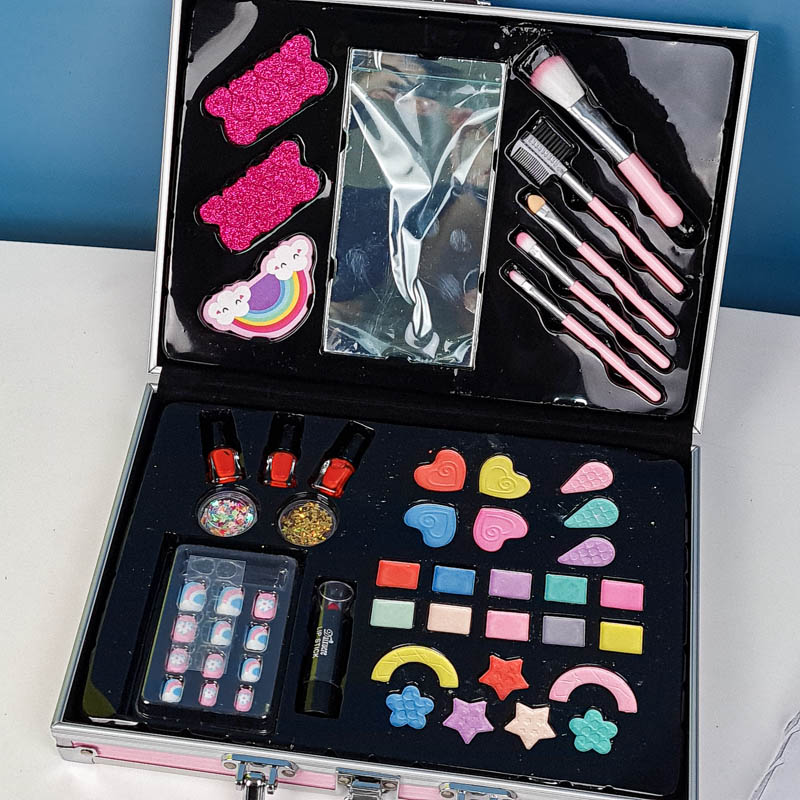 همه ی کوچولو ها دوست دارن که مثل مامانشون به خودشون برسن، ناخوناشونو خوشگل کنن و تو دنیای فانتزیشون یک آرایشگر حرفه ای باشن. ست لوازم آرایشی کودک چمدانی اومده تا این رویای بچه هارو محقق کنه. این ست با کیفیت و جذاب که برای بچه های بالای 3 سال طراحی شده. ست لوازم آرایشی کودک چمدانی دارایپلت سایه، رژ لب، لاک، اکلیل، ناخن مصنوعی، ست براش، آینه، پد انگشت، سوهان و... می باشد که بر پایه آب است و برای سلامتی کوچولوها هیچ خطری ندارد و به راحتی تمیز میشود. 5 مدل براش مختلف هم برای زدن سایه و رژ لب و رژگونه و... درون این ست قرار دارد همچنین این ست دارای سوهان ناخن و پد جدا کننده انگشت برای زیبا کردن ناخن است. این اسباب بازی مناسب پوست حساس بچه هاست و هیچ خطری برای آنها ندارد و به راحتی با آب از روی پوست پاک میشود.