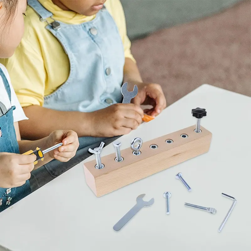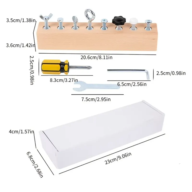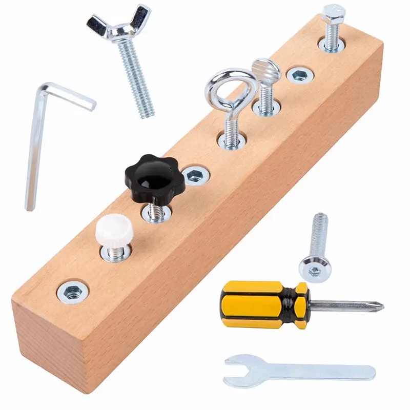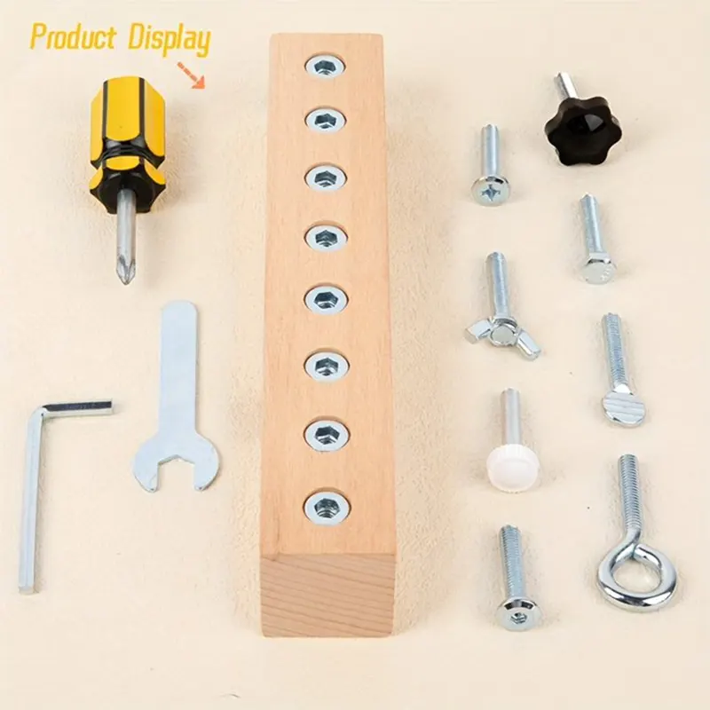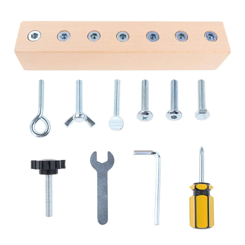 ست ابزار 11 تکه چوبی شامل پین چوبی، آچار آلن، پیچ گوشتی، آچار، 8 مدل مهره متفاوت است که برای کودکان 3 سال به بالا و عاشق ساخت و ساز یک هدیه عالیست. ست ابزار برای دست ورزی و باز و بسته کردن پیچ های مختلف توسط کودکان یک اسباب بازی ایده آل است