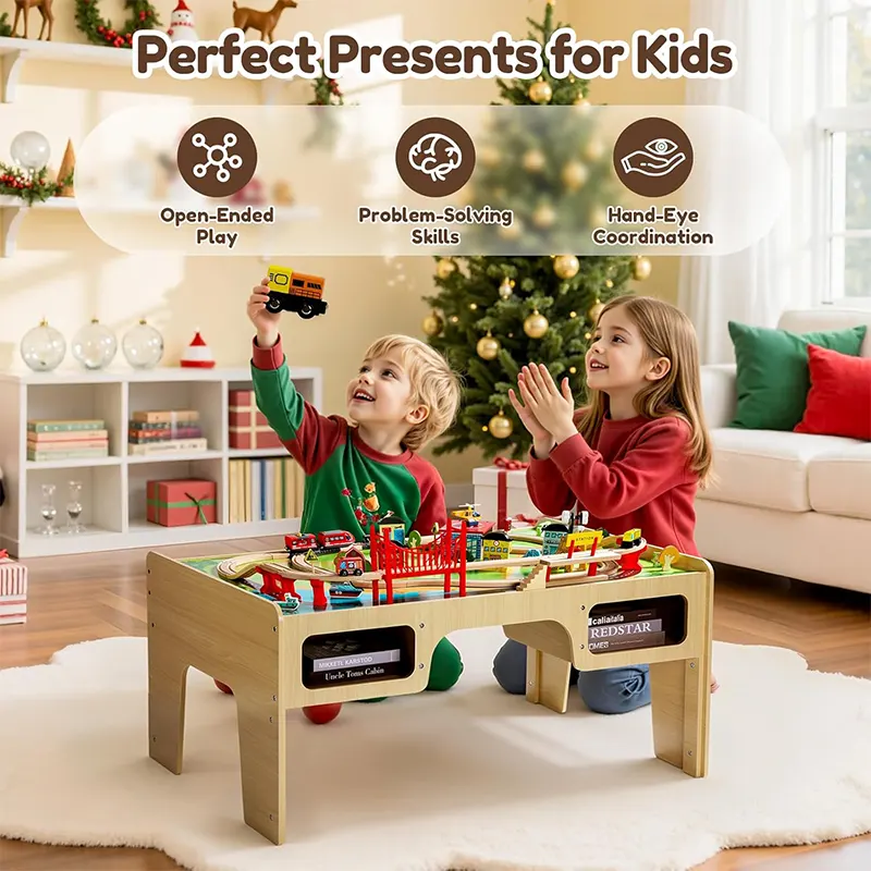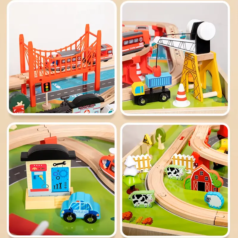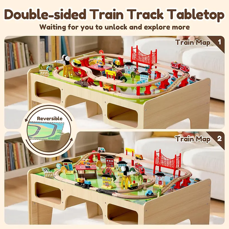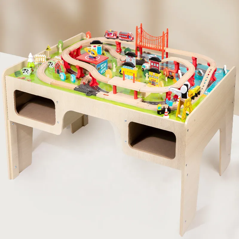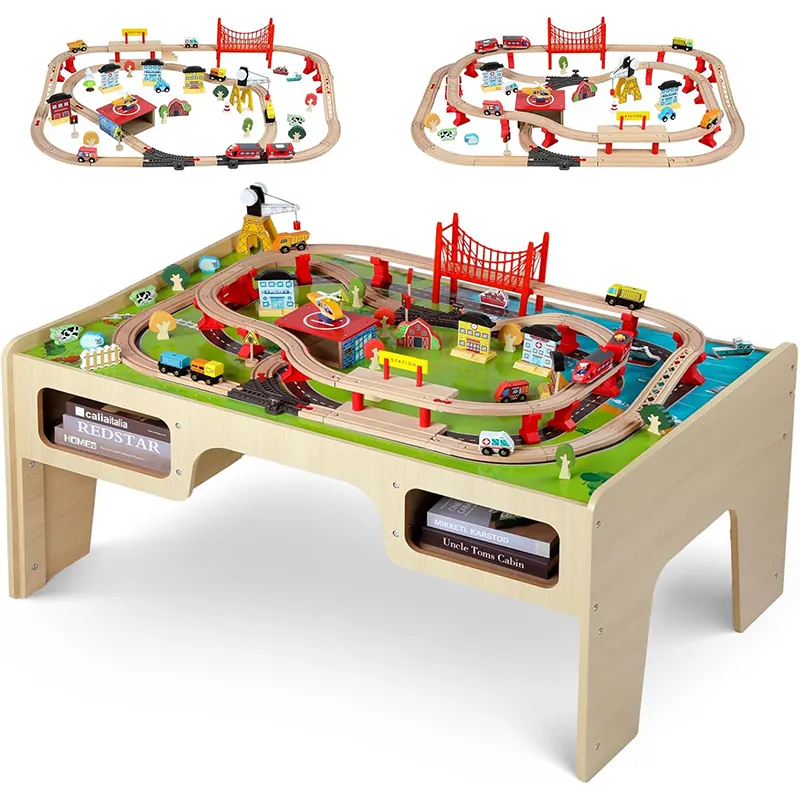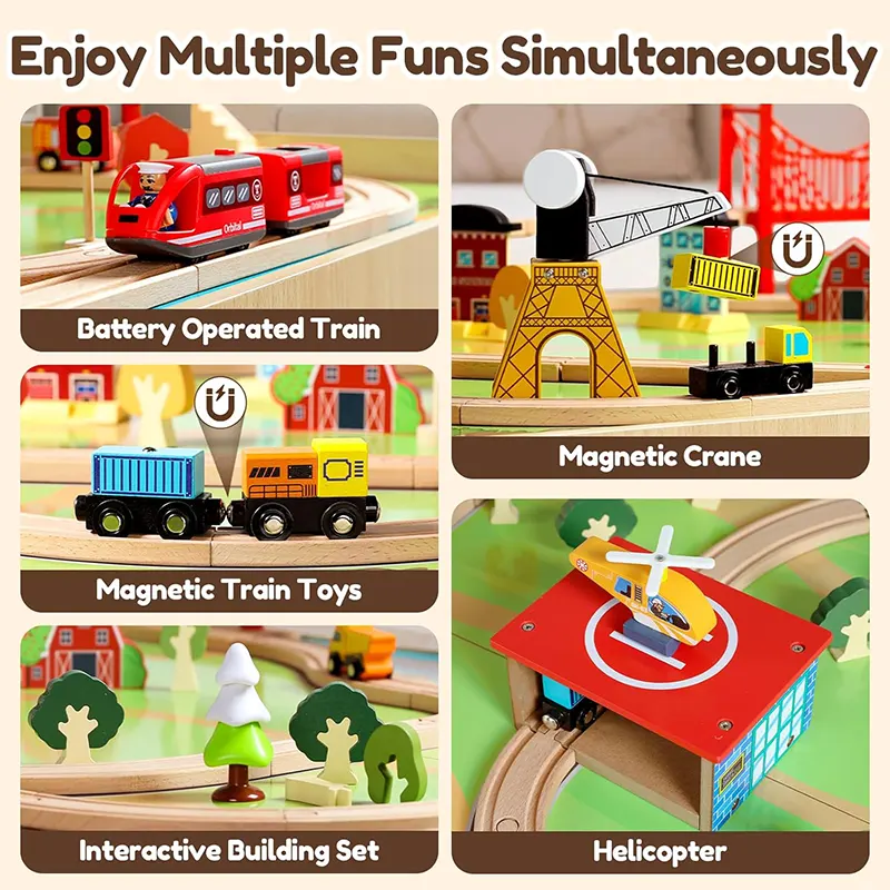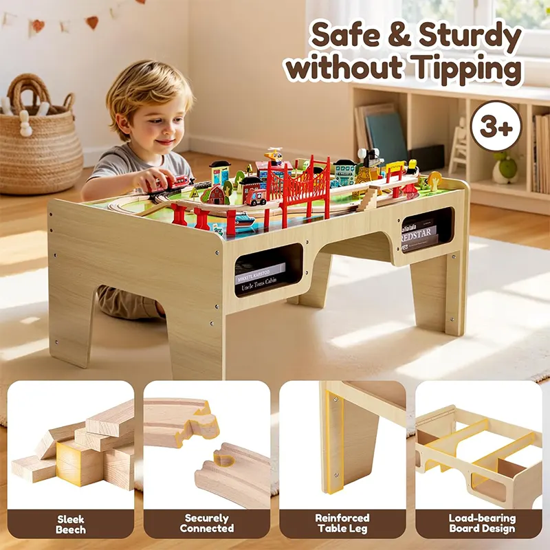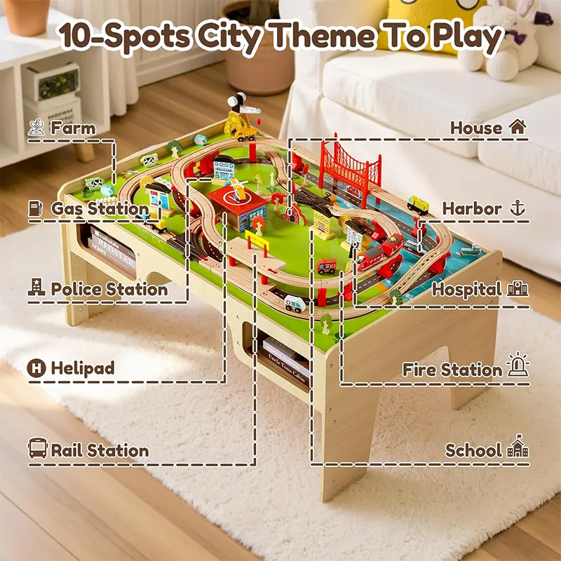 این میز بازی از قطعات چوبی مانندریل چوبی و لوازم سرگرمکننده مثل پل، ماکت درخت، علائم راهنمایی، جرثقیل، آدمک، خانه، برج مراقبت، هواپیما، قایق، قطار و...ساخته شده است و ساعتها بازی و سرگرمی را برای کودک فراهم میکند. این میز چوبی از چوب مرغوب و سازگار با محیط زیست و رنگهای طبیعی غیرسمی ساخته شده است. همچنین دو محفظه ذخیره در زیر میز قرار می گیرند که کودک به راحتی میتواند بعد از بازی قطعات را درون آن قرار دهند. بازی با این اسباب بازی چوبی موجب تقویت مهارت های حرکتی و قدرت ذهن و خلاقیت کودکان می گردد. بچه ها تخیل بسیار قوی دارند و عاشق رویاپردازی و خلق تخیلات خود روی این میز بازی چوبی هستند. آنها میتوانند ساعت ها مشغول بازی و ساخت و ساز در شهرک کوچک خود باشند. این میز فعالیت که از مواد مستحکم ساخته شده است، یک ایده هدیه فوق العاده برای تولد 3 سالگی خواهد بود!