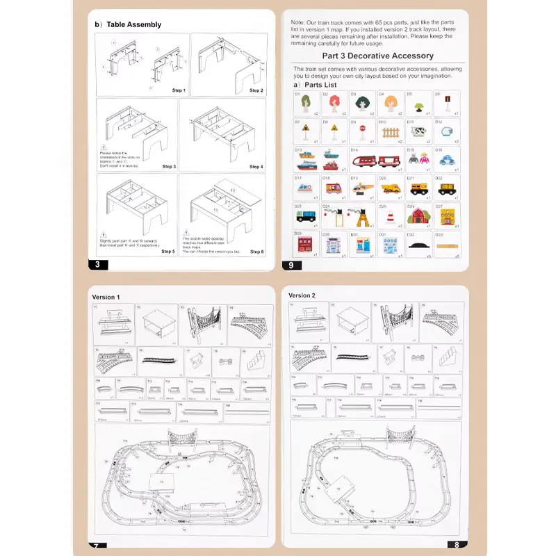 | اقلام همراه | اجزا برای ساخت میز بازی، قطعات ریل قطار چوبی، قطار، ماشین، هواپیما، خانه، حیوانات، درخت و.... |