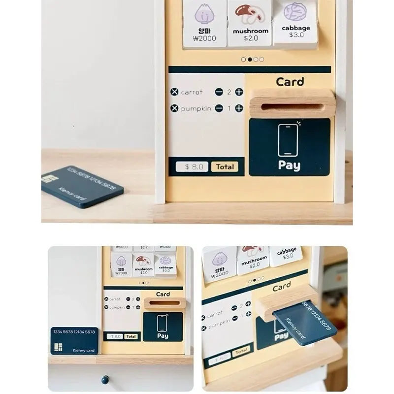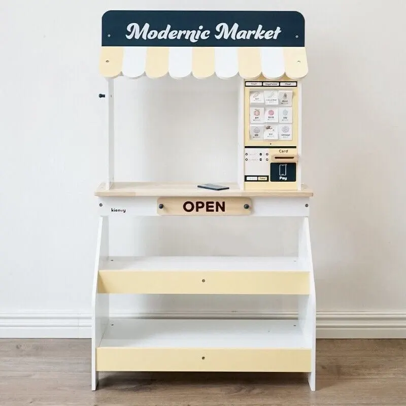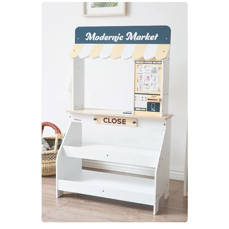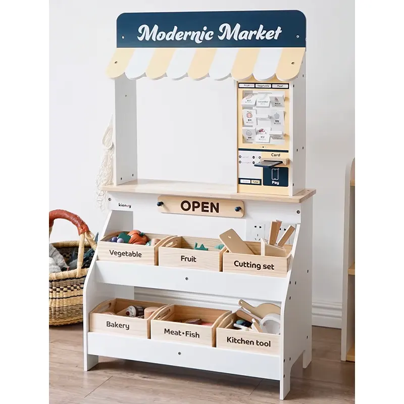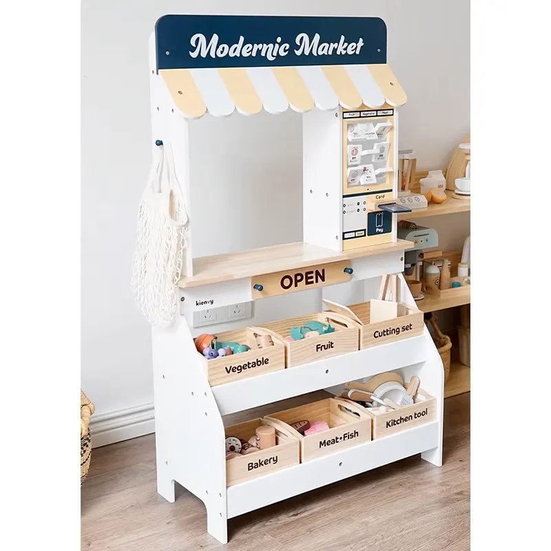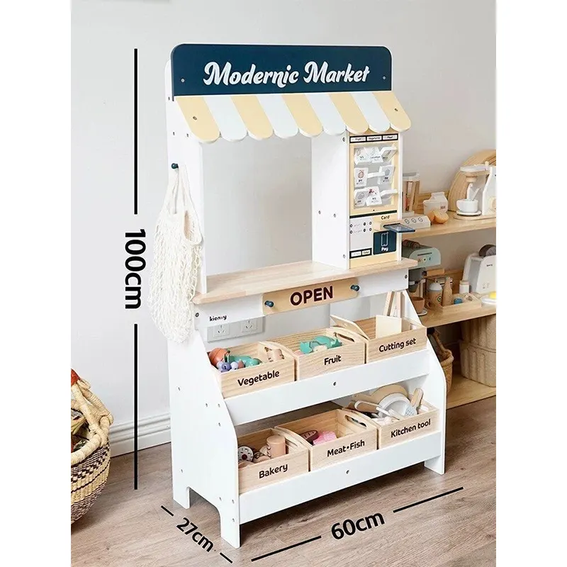 ویژگی اسباب بازی استند سوپرمارکت چوبی با لوازم: