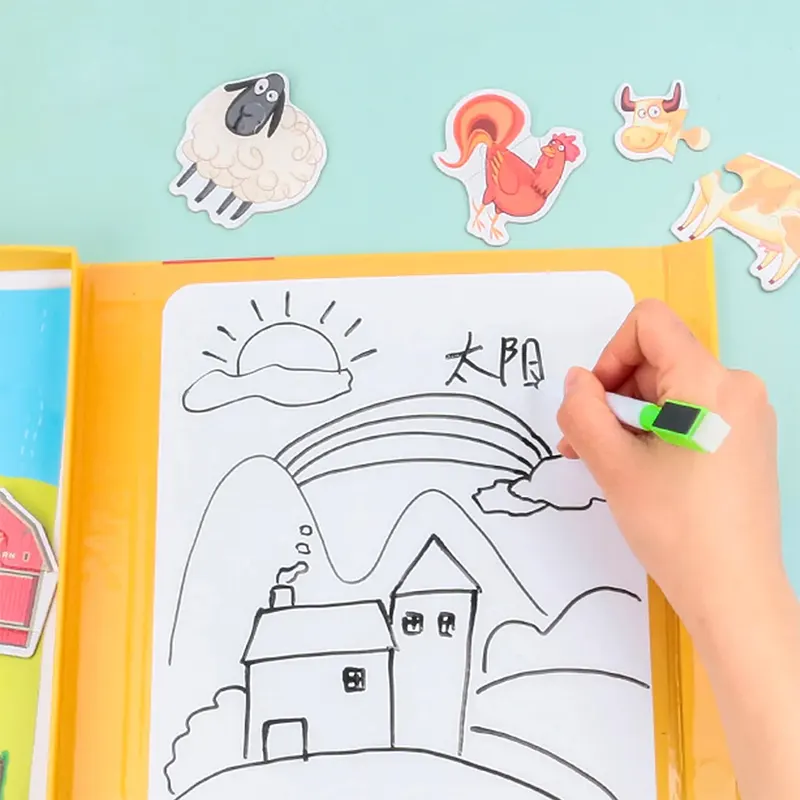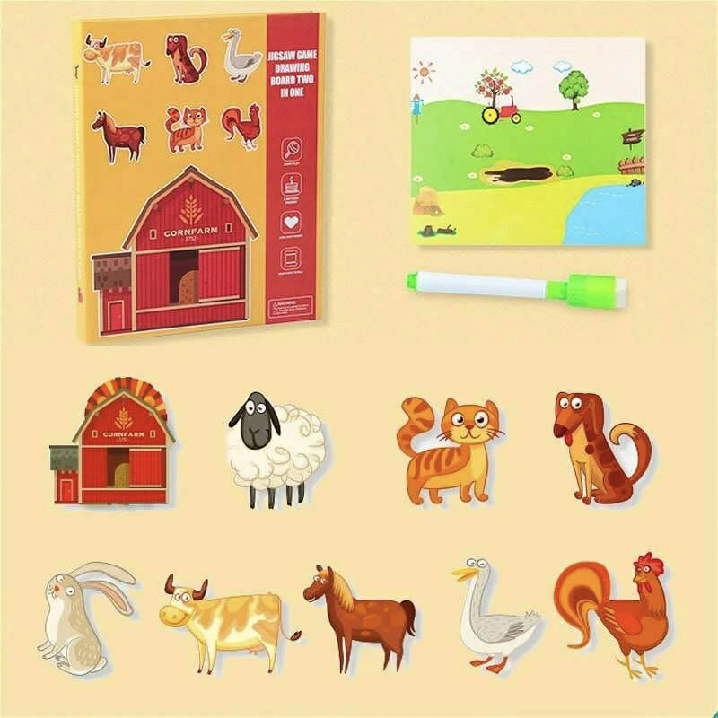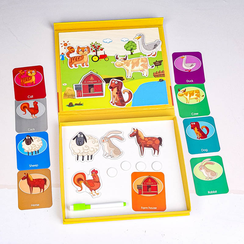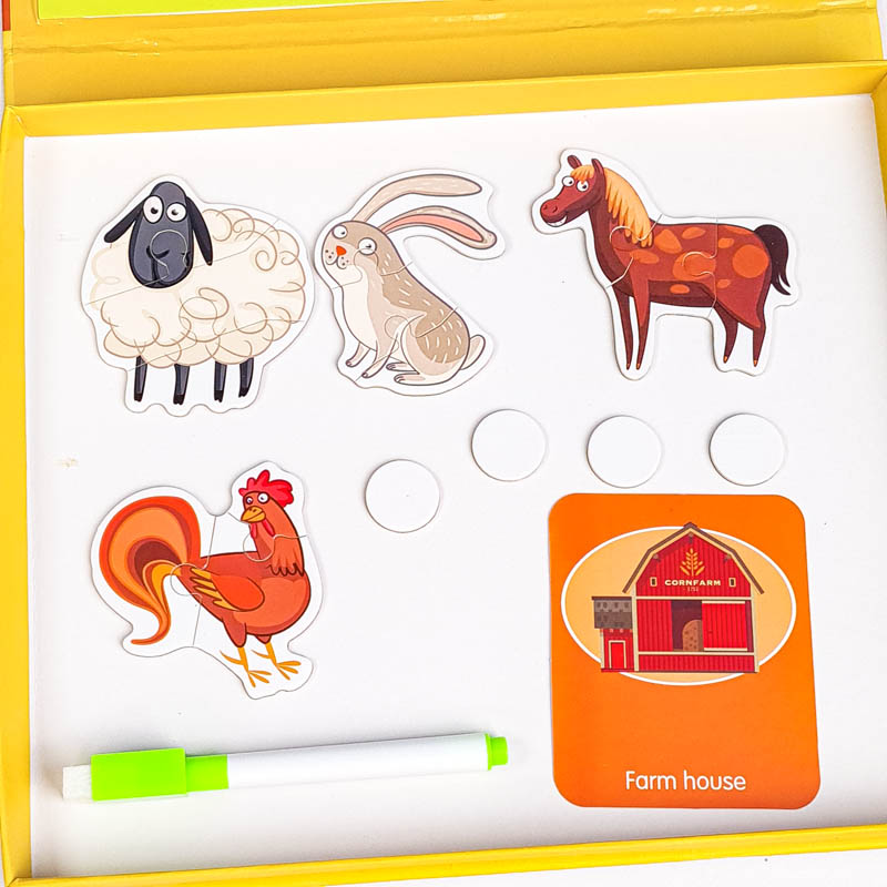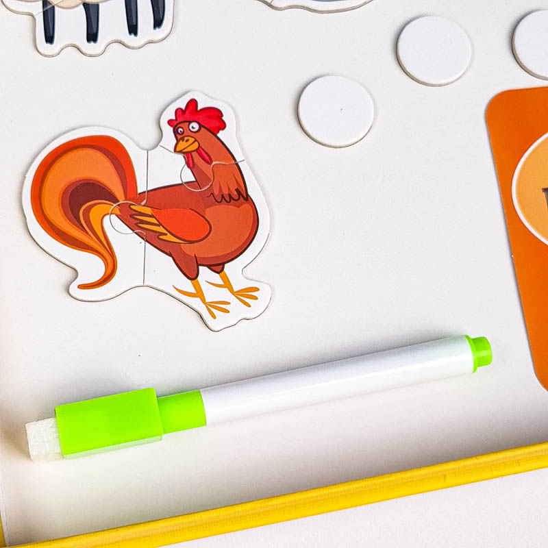حیوانات مزرعه رو دوست داری؟ دوست داری با چه حیوونی بیشتر آشنا بشی؟ یه گاو چاق و چله یا خرگوش بازیگوش؟ شایدم یه مرغ تپل و بامزه. بازی با قطعات مگنتی یک سرگرمی جذاب برای کوچولوهاست. پازل مگنتی وایت بردی مدل حیوانات مزرعه دارای 31 قطعه از اجزای حیوانات مختلف است که کودک میتونه به کمک 9 عدد از کارت های راهنما دو رو قطعات را جاگذاری کنند و از خلاقیت و تخیلشون در داستان سرایی و نقش بازی کردن استفاده کنند و برای هر حیوان داستان و ماجرای مختلف بسازند در پشت این کارت ها اطلاعاتی از حیوانات روی کارت درج شده تا اطلاعات کودکان را بالا ببرد. این اسباب بازی برای کودکان بالای 3 سال مناسب است. همچنین یک ماژیک هم همراه این کتاب هست که بچه ها میتونن روی تخته نقاشی داخل آن نقاشی بکشند و پاکش کنن.