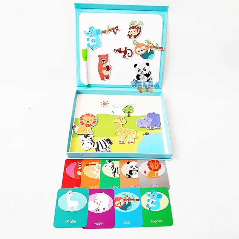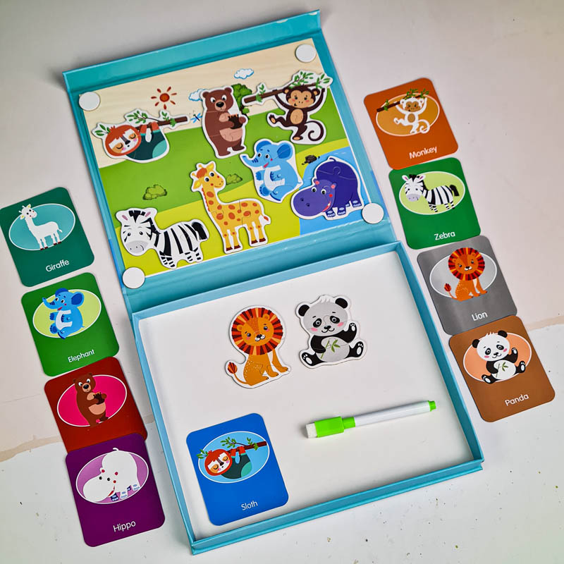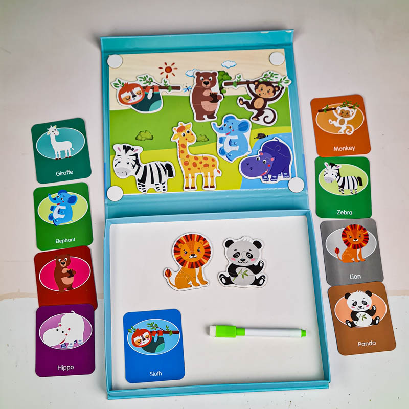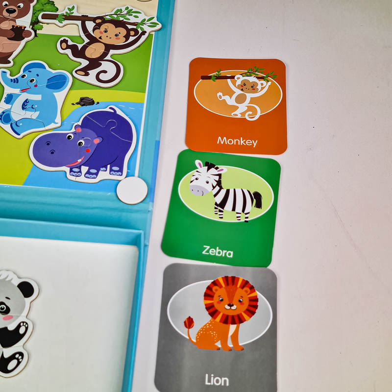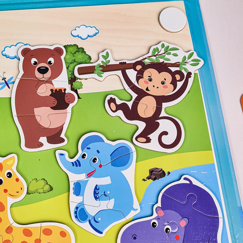 این اسباببازی مغناطیسی با آهنربایی که در پشت آن هست می تونه به روکش آهنی، تختههای طراحی مغناطیسی یا حتی یخچال وصل بشه همینطور از بین نمیره یا پاره نمیشه. اندازه قطعات پازل برای دست های کودکان مناسبه، به طوری که بچه ها به راحتی می تونند اونو نگه دارند اما به دلیل داشتن قطعات کوچک برای کودکان زیر 3 سال اصلا مناسب نیست. این پازل مگنتی به هماهنگی چشم و دست کودک، تشخیص رنگ، مهارت های حرکتی ظریف، مهارت های ادراک بصری، مهارت های حل مسئله کودک کمک میکند. همچنین در دار بودن این اسباب بازی یکی دیگه از ویژگی های مثبت این اسباب بازی است. بچه ها میتونن بعد از بازی، وسایل رو داخل محفظه چوبی قرار بدن تا از گم شدن قطعات این پازل مغناطیسی جلوگیری کنن. با کمک این پازل آموزشی کودکان می تونند الگو برداری از مدل را بیاموزند و با کمک کارت های راهنما حیوانات جنگل مختلف را کامل کنند. کودکان می توانند با استفاده از خلاقیت و نوآوری خود داستان سرایی کنند و داستان های مختلف برای هر حیوان تجسم کنند.
