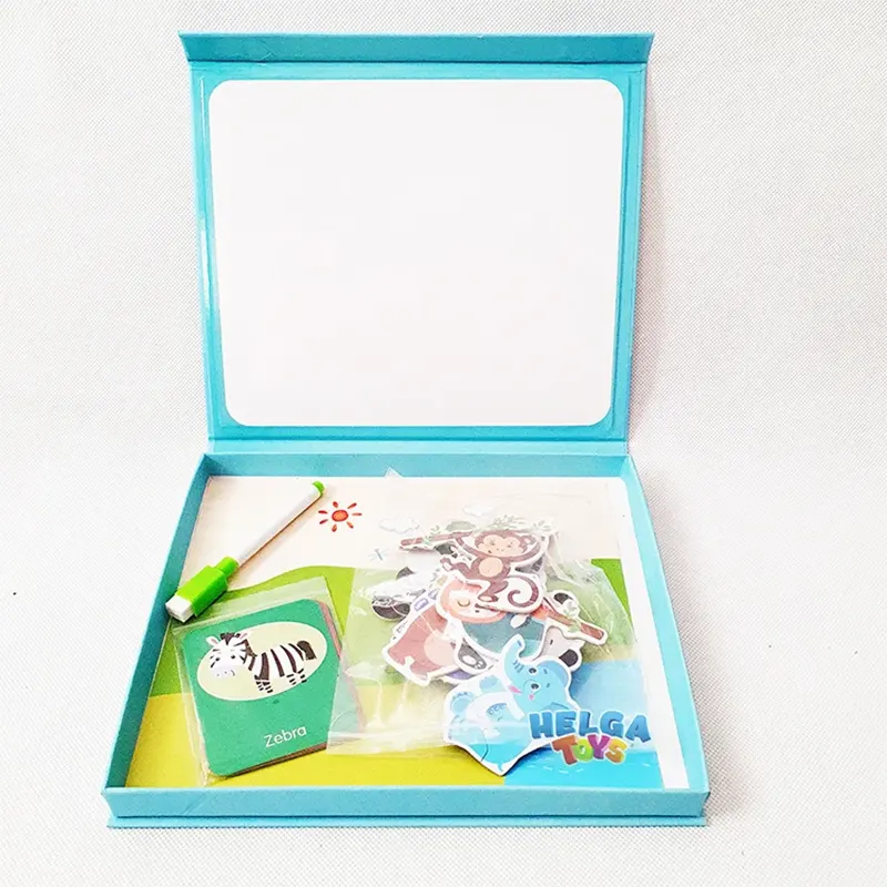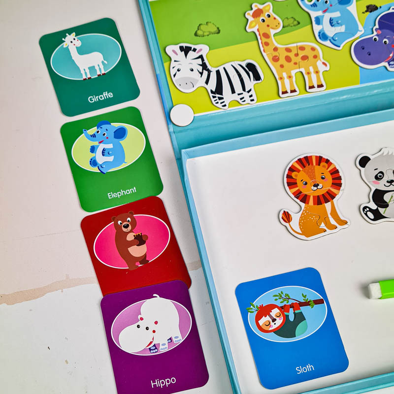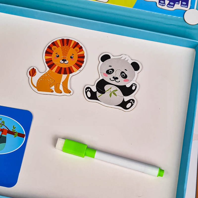 | اقلام همراه | صفحه بازی کاغذی، وایت برد مگنتی، 9 عدد کارت حیوانات، 31 عدد پازل مگنتی، ماژیک وایت برد |