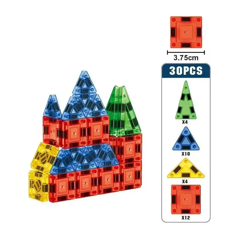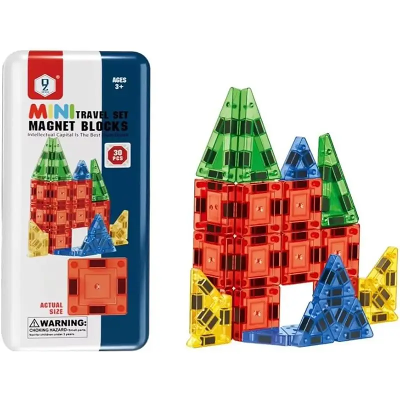 اسباب بازی کاشی مغناطیسی مسافرتی 30 تکه شامل 12 قطعه ی مربعی ساده، 4 قطعه متساوی الساقین، 10 قطعه متساوی الاضلاع، 4 عدد مثلث قائم الزاویه کوچک می باشد. کودکان می توانند با کاشی های مغناطیسی کوچک و جیبی در مسافرت های جاده ای و هواپیمایی ساعت های سرگرم بازی شوند.