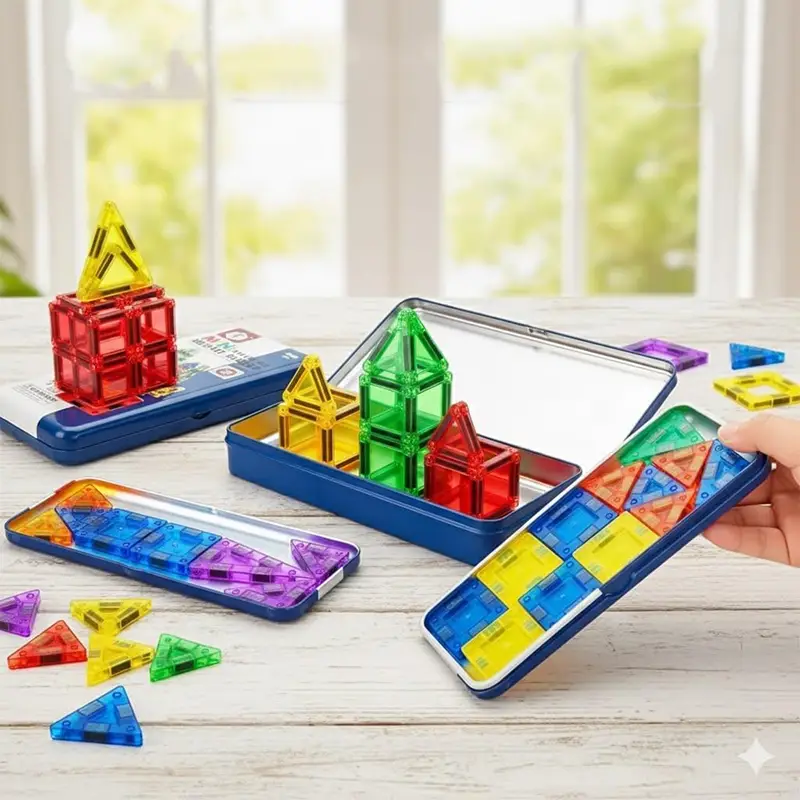 تقویت خلاقیت فرزندان هرگز زود نیست. کودکان می توانند از طریق بازی یاد بگیرند. در ابتدا با حس قوی رنگها و هندسه، از جمله اشکال سه بعدی، اعداد، قطب های مغناطیسی و طراحی معماری آشنا می شوند. همچنین بازی با کاشی های مغناطیسی موجب تقویت مهارت حل مسئله و تقویت صبر می شوند. این کاشی های مغناطیسی درون قوطی های فلزی قرار دارد که صفحه ای برای بازی و سرگرمی کودکان در سفر است و در پایان بازی قطعات کاملا درون قوطی قرار میگیرد و با بستن در آن از گم شدن و پخش و پلا شدن اسباب بازی مگنتی جلوگیری میشود