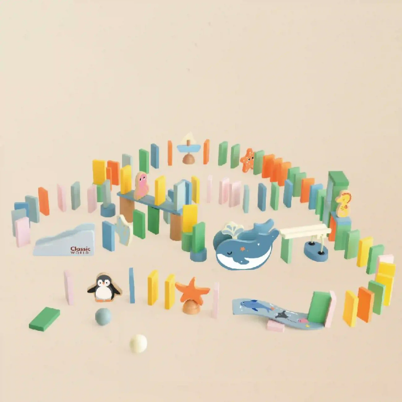 دومینو اقیانوس چوبی کلاسیک ورلد Classic World Ocean Dominoes یک سرگرمی مهیج و آموزشی برای کوچولو های دلبند شما می باشد و مناسب برای کودکان بالای 3 سال می باشد که با چیدن قطعات رنگی و زیبا، مهارتهای حل مسئله، تمرکز و هماهنگی دست و چشم رو تقویت میکنه.