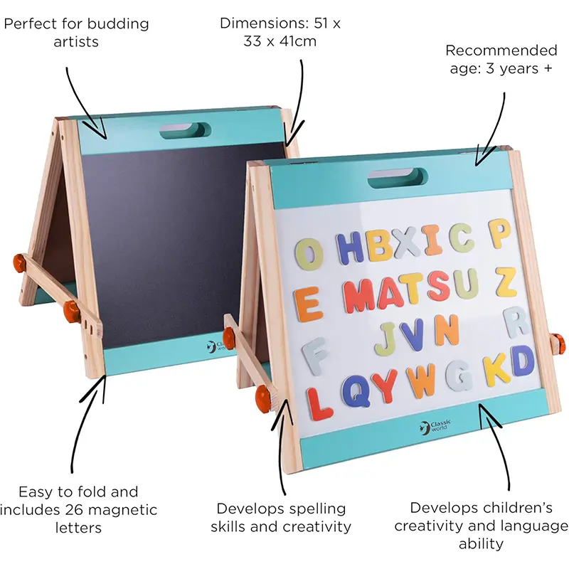 تختهسیاه و تختهسفید مغناطیسی رومیزی قابلجمعشدن برای کودکان وجود دارد تا بتوانند نقاشیهای زیبایی بکشند. این محصول شامل حروف انگلیسی مغناطیسی است کودک شما میتواند در حین خلق نقاشیها و آثار زیبا، مهارتهای زبانی خود را بیشتر توسعه دهد. تخته دو طرفه رومیزی کلاسیک ورلد Tabletop Easel classic world مناسب کودکان 3 سال به بالا است. تخته دو طرفه رومیزی کلاسیک ورلد Tabletop Easel classic world از چوب پایدار ساخته شدهاند که میتواند به خوبی در برابر استفادههای شدید، مقاومت کند و رنگ غیرسمی اضافی به حفظ ایمنی کودکان کمک میکند.