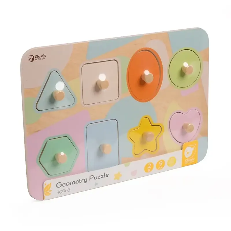 پازل چوبی هندسه کلاسیک ورد Classic World یه سرگرمی مفید و آموزشی برای بچههاست که از 9 قطعه مختلف تشکیل شده تا کار مامان و باباها رو برای آموزش اشکال هندسی راحتتر کنه! کوچولوها با این پازل چوبی و مقاوم به بهترینترین روش، اشکال مختلف مثل دایره، بیضی، مربع، مستطیل، قلب، مثلث، شش ضلعی و ستاره و رنگهای مختلف رو یاد میگیرن و به راحتی میتونن قطعات رو با استفاده از پایهی چوبی، در جای درست قرار بدن.