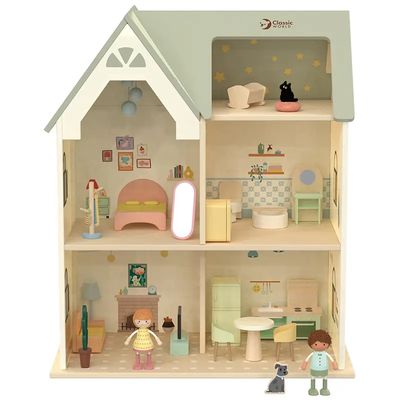 خانه عروسک چوبی کلاسیک ورلد Cozy Cottage Classic World با ارتفاع 55 سانتی متر و با دو طبقه و یک زیر شیروانی و همچنین لوازم مینیاتوری خانه، سرآغاز داستان های تخیلی برای کودک و عروسک هایش است. خانه عروسکی چوبی برای کودکان 2 سال به بالا هدیه بی نظیر است تا داستان های خود را در کنار عروسک هایشان بسازند. این خانه عروسکی 2 طبقه برای قسمت های مختلف خانه مانند آشپزخانه، نشیمن، سرویس بهداشتی و اتاق خواب و یک زیر شیروانی برای پت خانگی دارند و با داشتن لوازم خانه مانند تخت خواب، سرویس بهداشتی، وان حمام، روشویی، سینک، یخچال، اجق گاز، میز و صندلی غذا خوری، نشیمن، تلویزیون و... و همچنین با داشتن 2 آدمک دختر و پسر و یک گربه بازیگوش انتخابی عالی برای نقش بازی و گفتن و سراییدن داستان های جالب و فانتزی توسط بچه ها میشود. این خانه عروسکی برای رده سنی بالای 2 سال کاملا مناسب است.