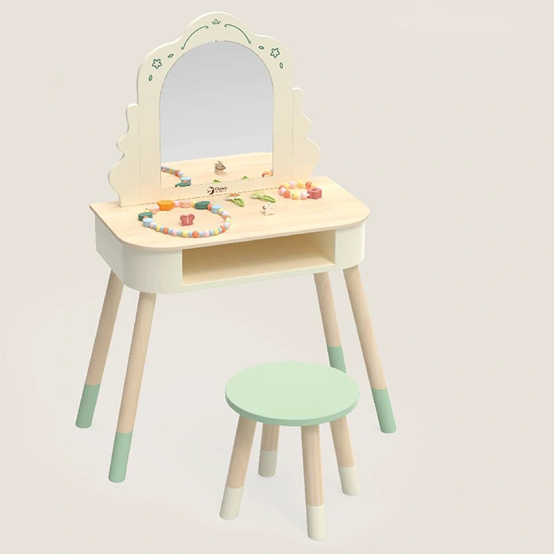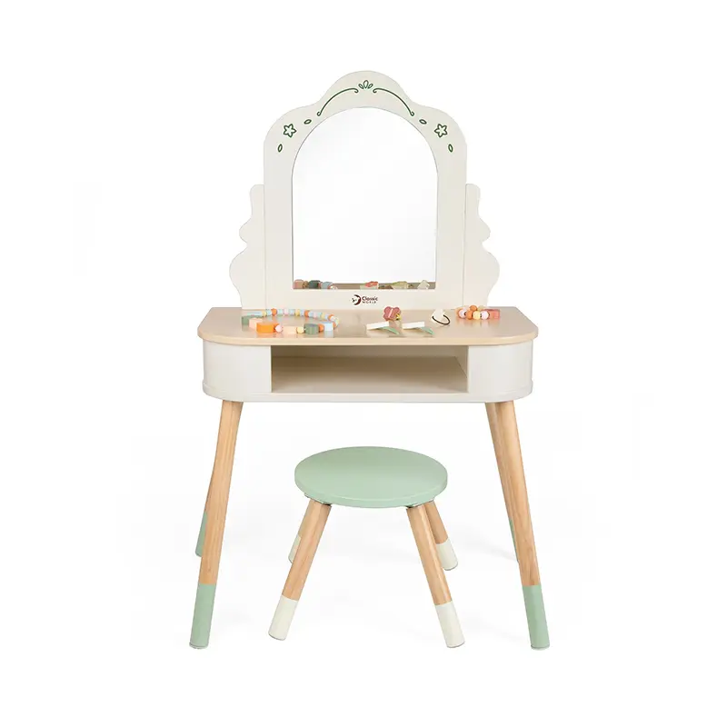 - این میز آرایش کودک آینه ی بزرگ و یک محفظه و یک صندلی دارد.