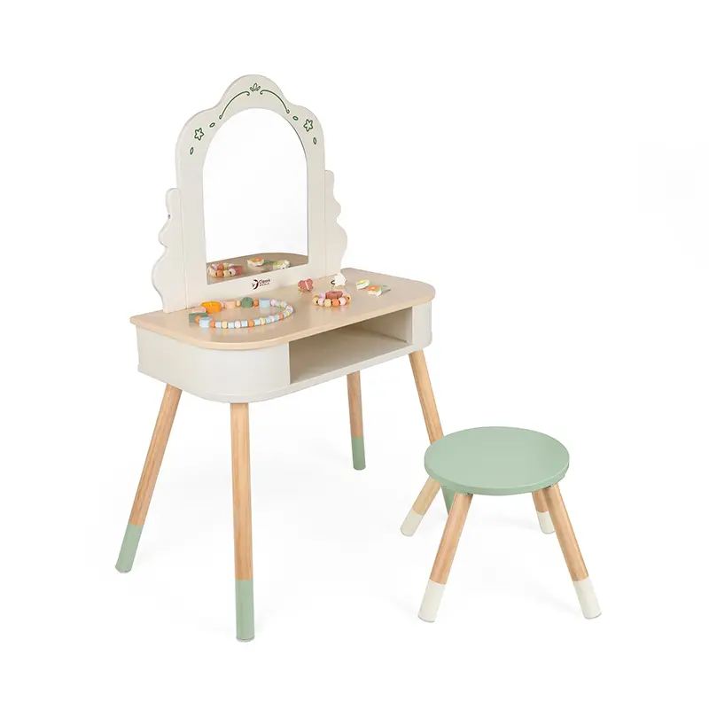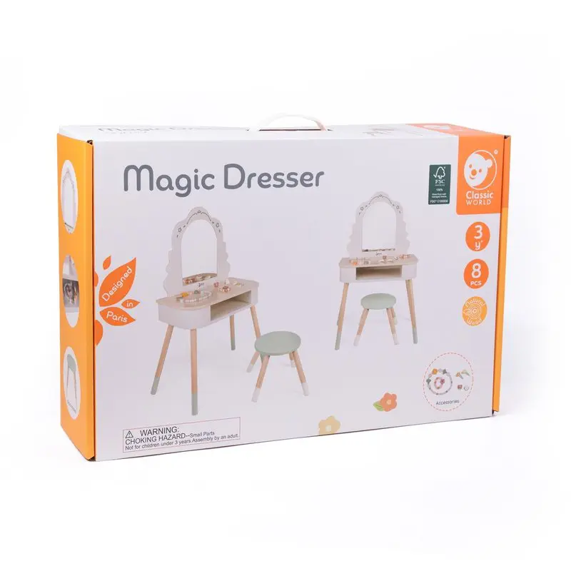 میز آرایش چوبی کلاسیک ورلد Classic World Magic Dresser یک اسباب بازی دخترانه دوست داشتنی برای کوچولوهاست. همه ی کوچولو ها دوست دارن که مثل مامانشون به خودشون برسن، موهاشونو خوشگل کنن و آرایش کنن! این میز آرایش بچه گانه بسیار زیبا، با کیفیت و بادوام است که از طرح و رنگ فانتزی تشکیل شده است و هدیه ای فوق العاده برای کودکان بالای 3 سال است.میز آرایش چوبی کلاسیک ورلد Classic World Magic Dresser و تمام لوازمی که به همراه آن است چوبی میباشند. اسباب بازی چوبی همیشه انتخابی مطمئن، شیک و ماندگار است، بنابراین اگر به دنبال یک میز آرایش چوبی کودک زیبا و بادوام میگردید این محصول برای شما کاملا ایده آل است.