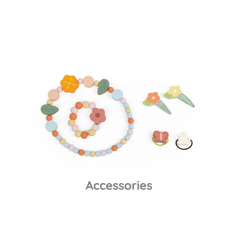 - وسایل این میز آرایش بچه گانه شامل میز آرایش، صندلی، آینه، گردنبند، دستبند، انگشتر میباشد.