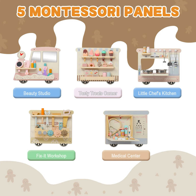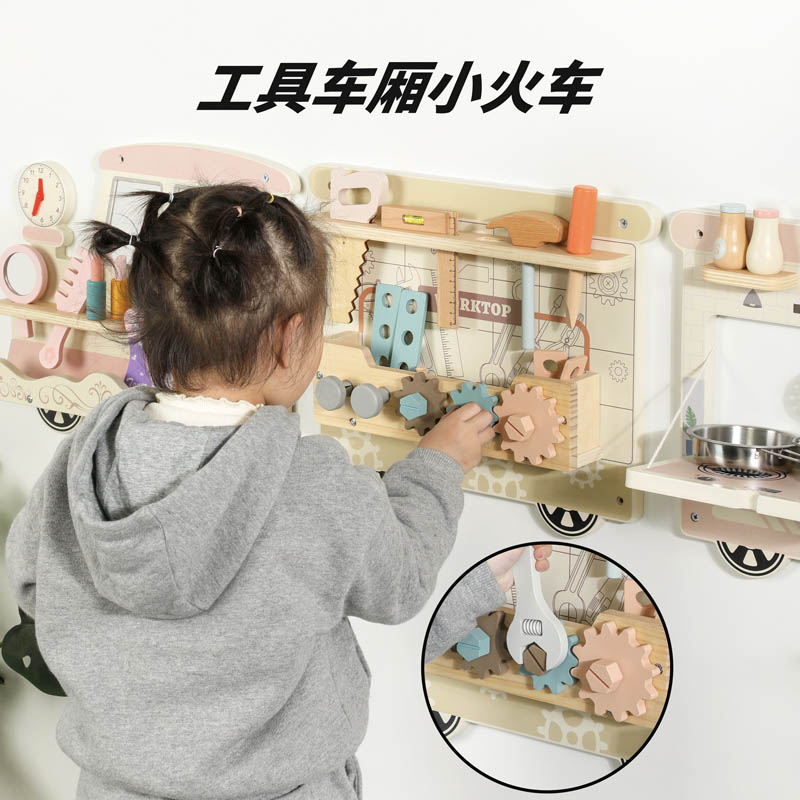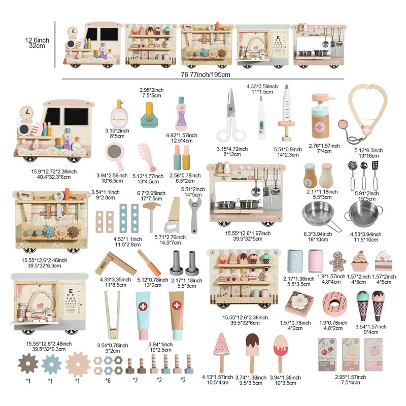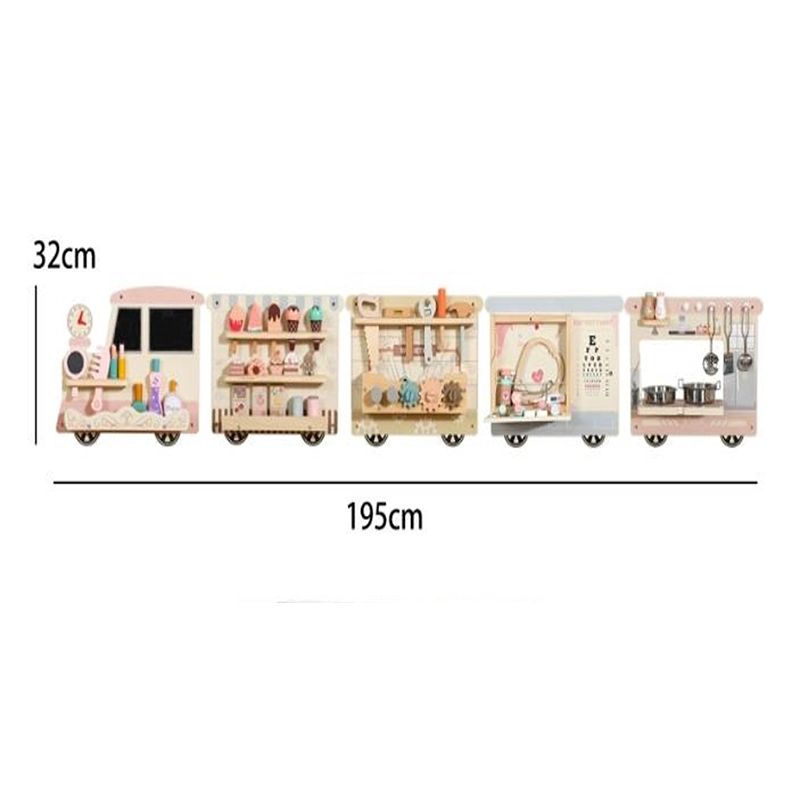 اسباب بازی چوبی ایستگاه مشاغل مدل قطار یک قطار از جنس چوب با کیفیت و مقاوم است که دارای 5 ایستگاه با مشاغل مختلف مانند آشپزی، پزشکی، نجاری، زیبایی، بستنی است در هر ایستگاه اکسسوری هایی مطابق با مشاغل مخصوص مانند دیگ و قابلمه، کفگیر، گوشی پزشکی، دارو، قرص، اره، پیچ گوشتی، چکش، بستنی، نوشیدنی، کیک، شانه، آینه و... قرار دارد که بر نقش آفرینی و خلاقیت و مهارت های دست ورزی کودکان 3 سال کمک میکند. این ایستگاه برای مهد کودک و خانه بازی، کارگاه های مادر و کودک و... مناسب است.