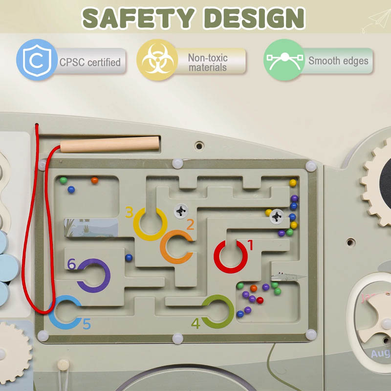 - این اسباب بازی باعث افزایش خلاقیت کودکان، تقویت مهارت تشخیص و تمایز رنگ ها، هماهنگی بین چشم و دست کودک از طریق گرفتن و حرکت دادن و اتصال اجزای این بیزی برد می شود.