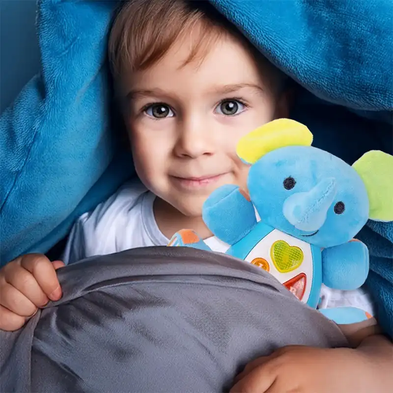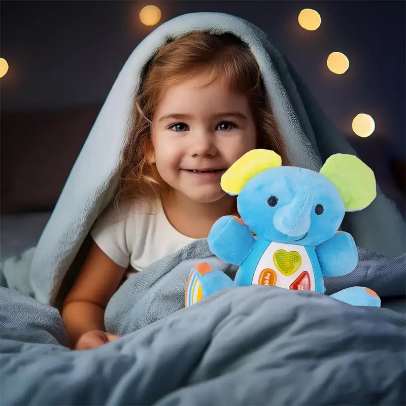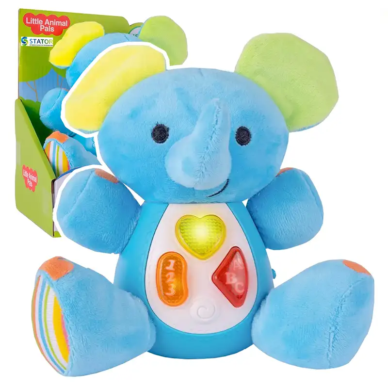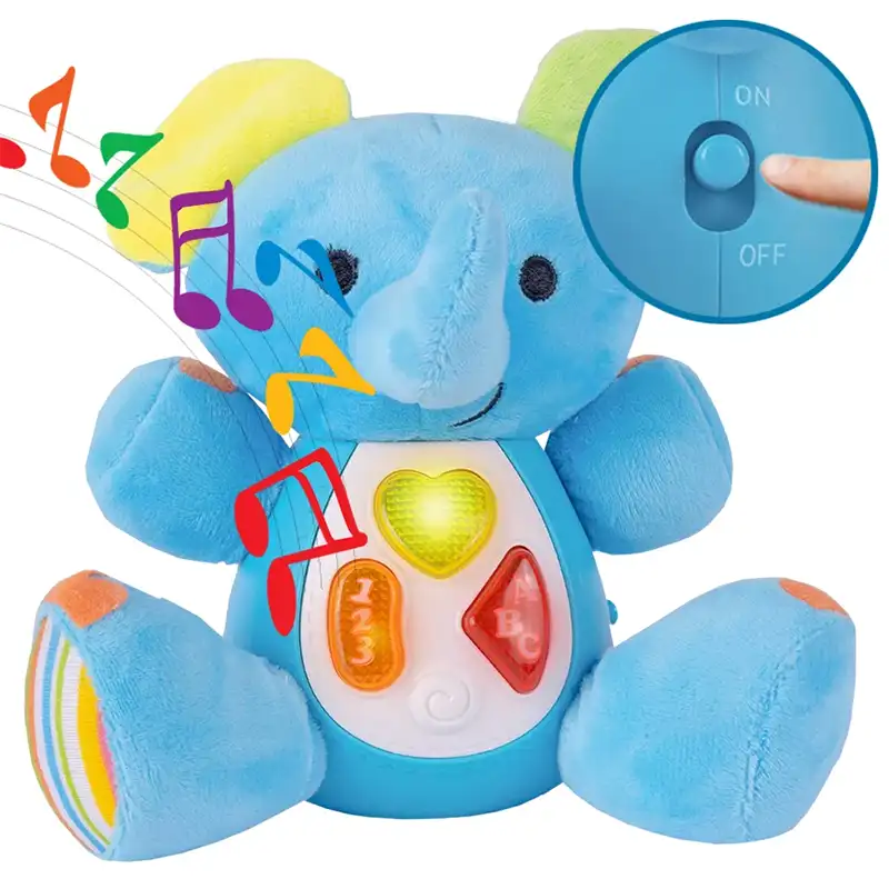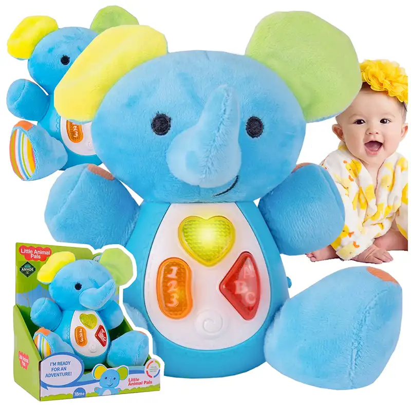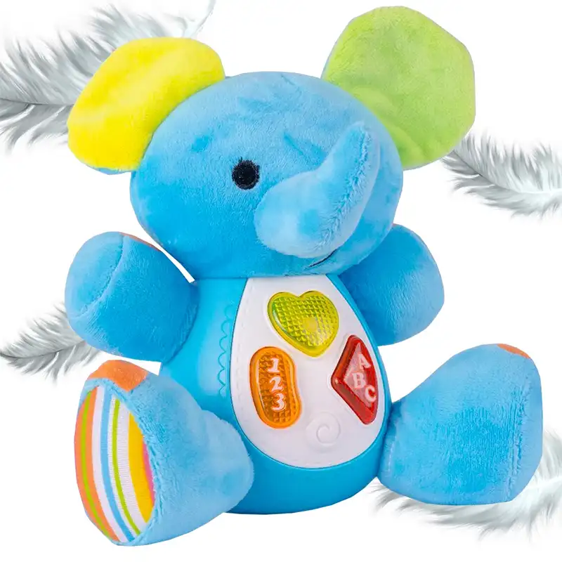 عروسک پولیشی موزیکال طرح فیل قطعا هدیه ی فوق العاده ای برای کودکان 18 ماه به بالا است. عروسک پولیشی موزیکال طرح فیل دارای جلوه های نوری و صوتی مانند موزیک های کودکانه و صداهایی مانند صدای مامان و بابا، صدای خنده و گریه و.... است که کودکان را ساعت ها غرق در دنیای نقش بازی میکند. این عروسک پولیشی موزیکال، دارای دکمه ای در پهلوی خود است که با روشن کردن و زدن دکمه های روی شکمش صداهای بامزه از خود پخش میکند. ایده آل برای ارتقاء قدرت شنوایی و حس لامسه کودک ومناسب رده سنی بالای 18 ماه است. عروسک بازی باعث تقویت مهارت های جسمی و ذهنی کودک می شود چون که کودکان از طریق بازی کردن می آموزند.