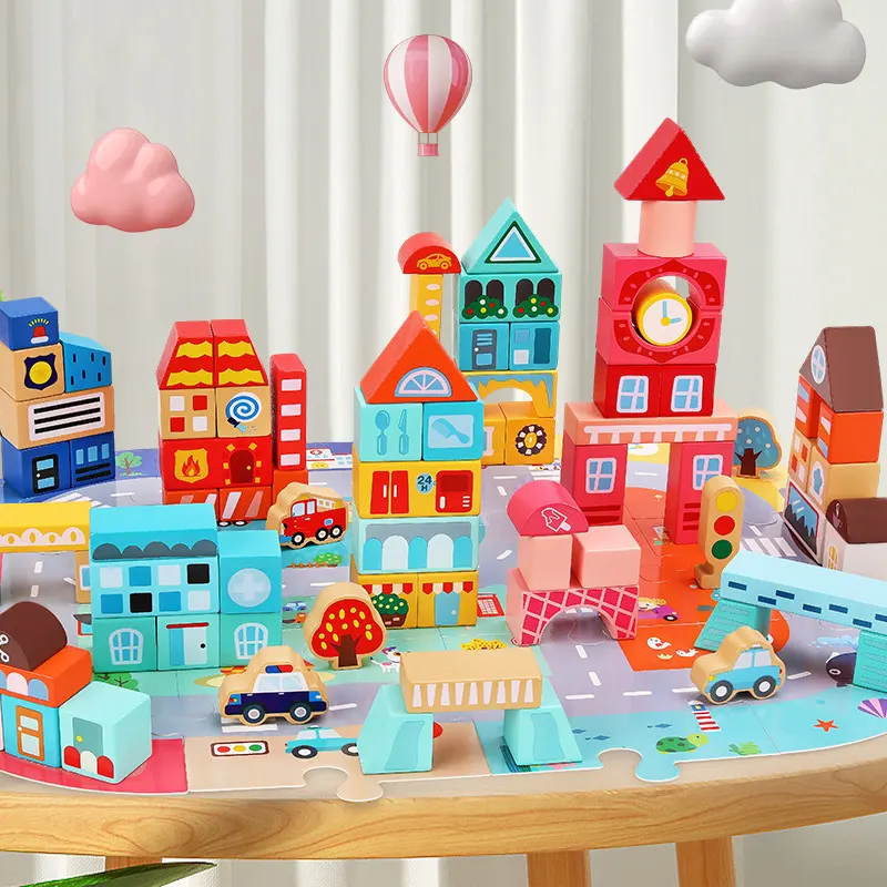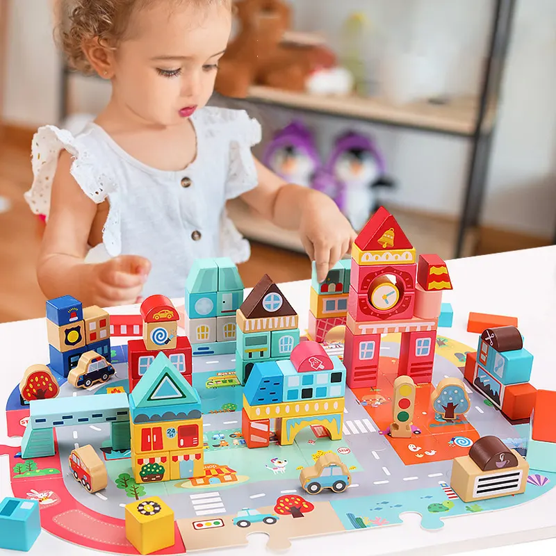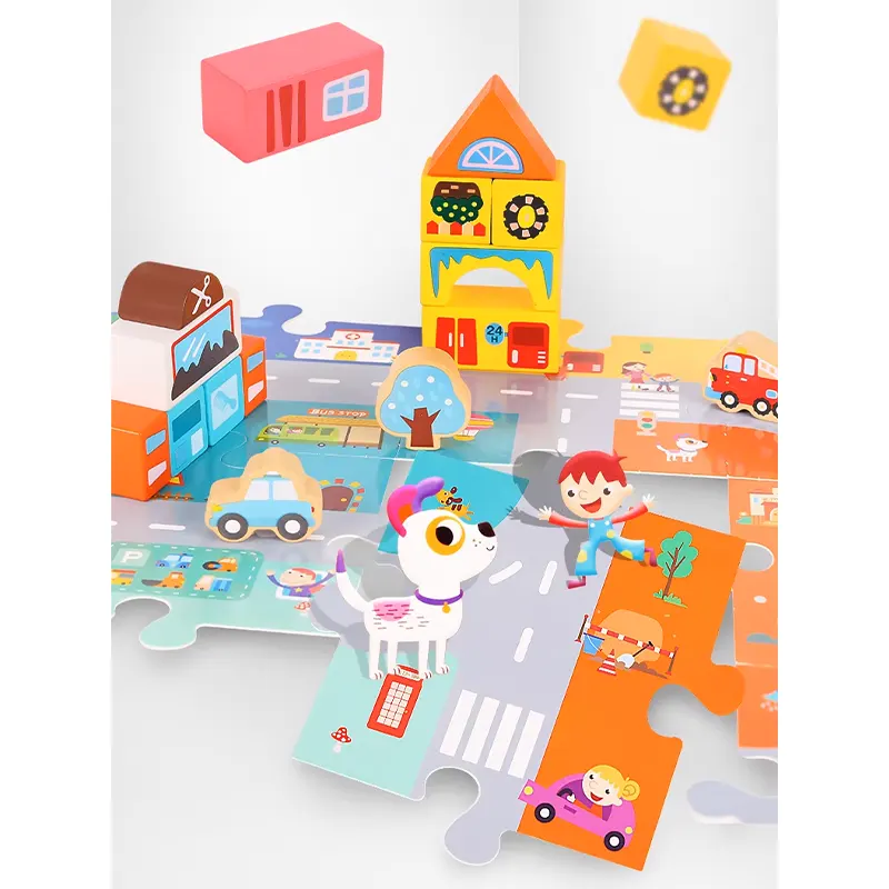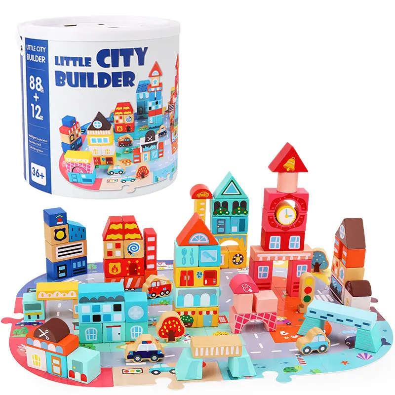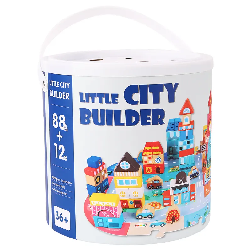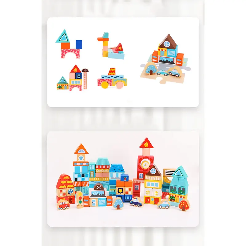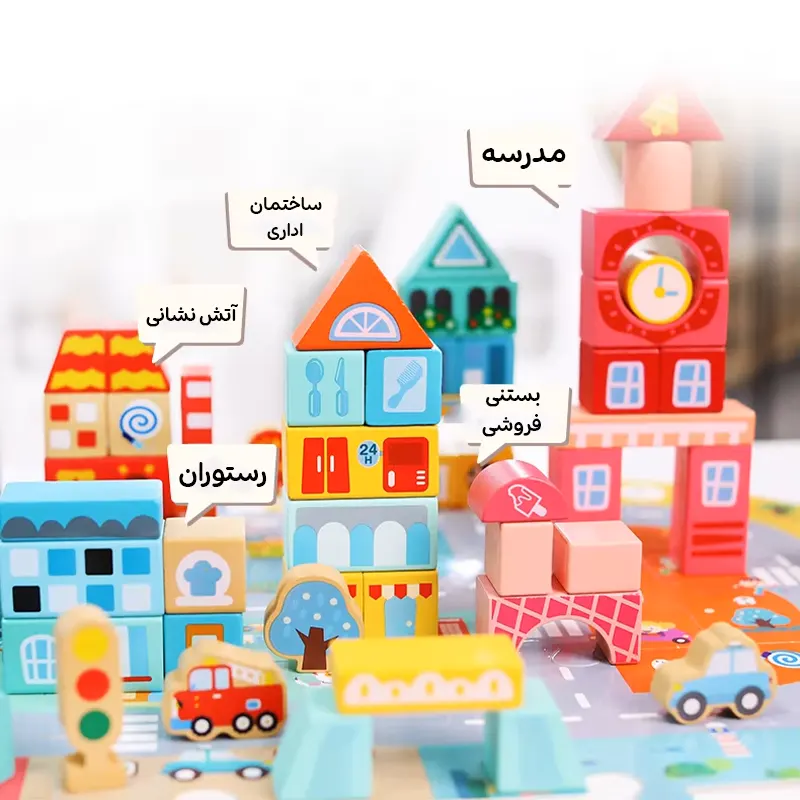 مجموعه بلوک های چوبی ساختنی به کودکان کمک می کند تا یک شهر عالی بسازند. یک صفحه پازلی هم در این مجموعه وجود دارد که کودک میتواند ساختمان ها را روی آن بسازد و وانمود کند که در یکی از ماشین ها یا وسایل نقلیه برای گردش و تفریح یا برای انجام کار مهم روزانه در شهر رفت و آمد میکند؛ با گذشتن از مدرسه، به بستنی فروشی رسیدید، خودتون رو به یک بستنی مهمان کنید، سپس به سوپرمارکت بروید و برای استراحت به هتل برگردید. یک اسباب بازی عالی برای داستان سرایی، نقش بازی، افزایش خلاقیت، مهارت های دست ورزی، هماهنگی دست و چشم، مهارت های حرکتی ظریف، مهارت های حل مسئله، تشخیص شکل و رنگ کودک است.
