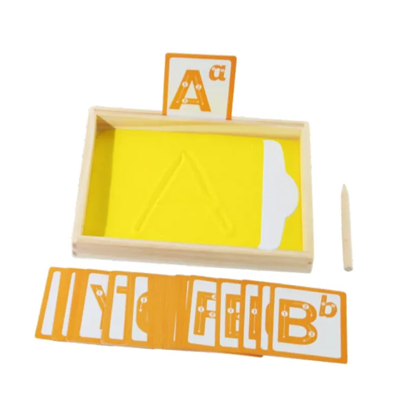 شن ها روی صفحه ی پایه ریخته شده و با کمک خط کشی که درون بسته بندی است شن ها را صاف کنید و یکی از کارت ها را در قسمت مخصوص قرار دهید و املای حرف الفبا و کلمات را با کمک قلم چوبی درون بسته بندی روی شن ها تمرین کنید. لمس شنها و کشیدن حروف بر روی شن کمک می کند تا مهارتهای حرکتی ظریف دستان کودک تقویت شود که در یادگیری آنها بسیار تاثیر گذار است. اگر کودک کلاس اولی دارید تخته شنی برای دست ورزی و یادگیری لوحه ها بسیار کمک می کند قبل از اینکه کودک دلبندتان شروع به نوشتن لوحه ها و نشانه ها کند، از او بخواهید بر روی شن ها دست ورزی را انجام بدهد تا بتواند بطور صحیح جهت های نوشتن نشانه ها را انجام بدهد.