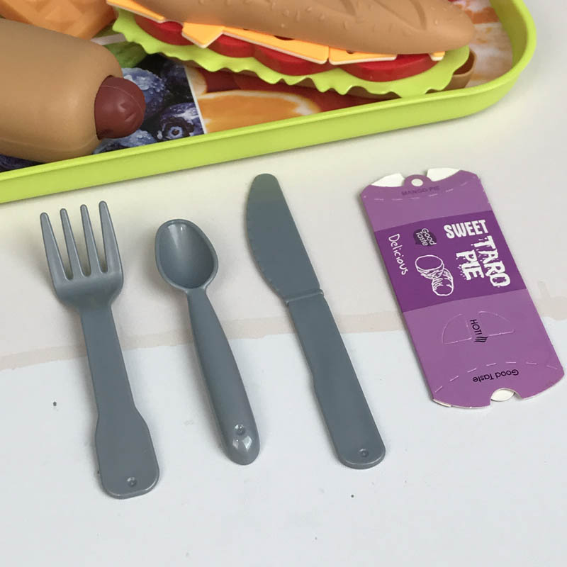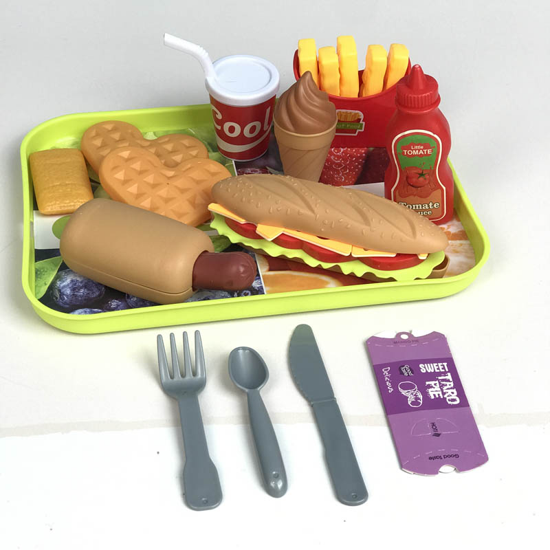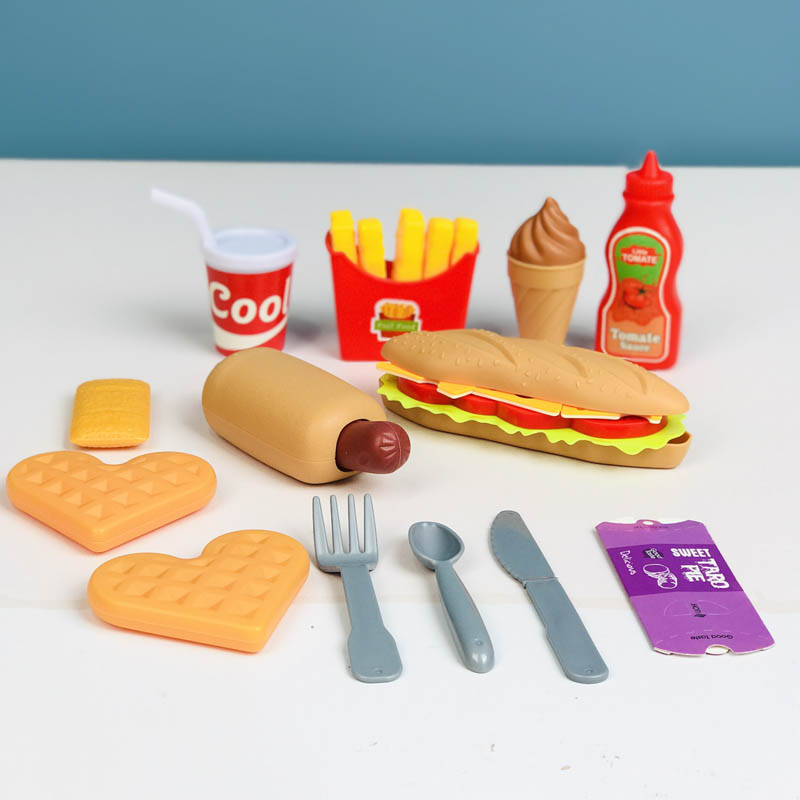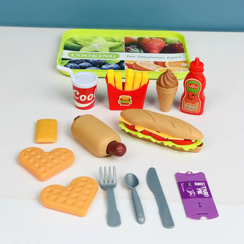 ست اسباب بازی ساندویچ و سیب زمینی شامل ساندویچ و مخلفات، 5 تکه سیب زمینی، ظرف سس، وافل، ناگت، بستنی قیفی، نوشابه لیوانی، ساندویچ سوسیس، قاشق و چنگال میباشد که همگی بر روی یک سینی سرو درون بسته بندی زیبا قرار دارند. رنگ های شاد، اسباب بازی خوراکی های خوشمزه و بسته بندی جذاب این اسباب بازی کودک آن را به یک هدیه ایده آل تبدیل میکند و اشتیاق و اشتهای کودک را برای خوردن غذای واقعی بیشتر میکند.