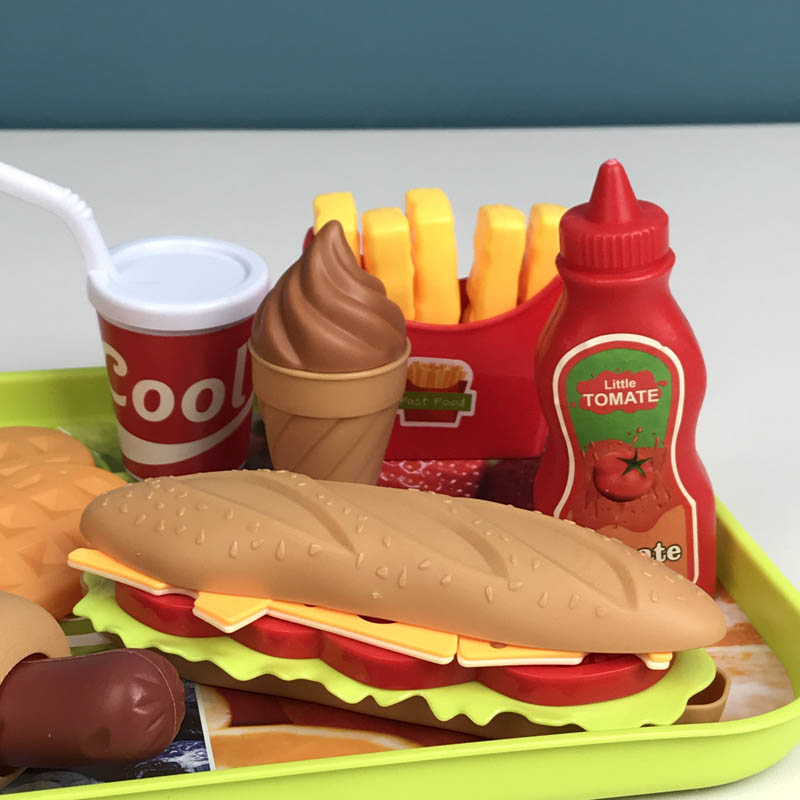 کودک شما میتواند در نقش یک آشپز ماهر برای مهمان هایش غذا درست کند و یا در نقش یک مشتری گرسنه از غذایش در یک رستورن زیبا لذت ببرد.ست اسباب بازی فست فود بهترین هدیه برای کودکان بالای 3 سال است که عاشق غذا و پذیرایی هستند. قطعات خوراکی و قابل جدا شدن نیز میباشند و کودک میتواند آن ها را روی هم بچیند و حس واقعی درست کردن ساندویچ را تجربه کند.( قطعات خوراکی ها چسبی و قابل جدا شدن است).
